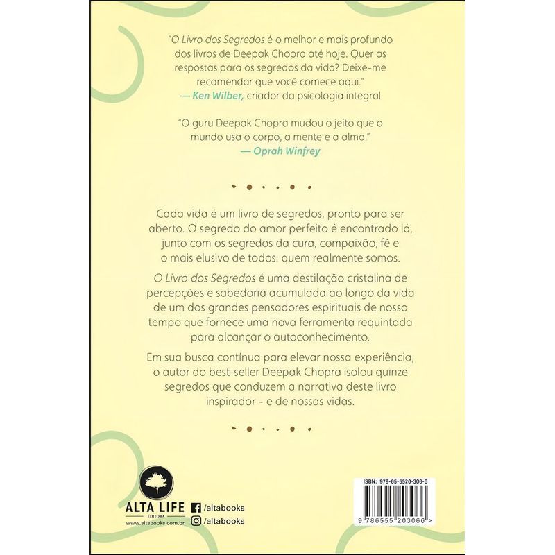 Cada vida é um livro de segredos, pronto para ser aberto. O segredo do amor perfeito é encontrado lá, junto com os segredos da cura, compaixão, fé e o mais elusivo de todos: quem realmente somos. O Livro dos Segredos é uma destilação cristalina de percepções e sabedoria acumulada ao longo da vida de um dos grandes pensadores espirituais de nosso tempo que fornece uma nova ferramenta requintada para alcançar o autoconhecimento. Em sua busca contínua para elevar nossa experiência, o autor do best-seller Deepak Chopra isolou quinze segredos que conduzem a narrativa deste livro inspirador – e de nossas vidas. Deepak Chopra é certificado pelo Conselho em Medicina Interna, Endocrinologia e Metabolismo, membro do American College of Physicians e membro do American College of Physicians Association of Clinical Endocrinologists. Além disso, é autor best-seller com mais de 100 mil livros vendidos no Brasil. Neles, Chopra traz a verdadeira solução para enfrentar grandes desafios na vida. Ao longo de sua carreira como médico, professor e autor best-seller, Deepak Chopra recebeu milhares de perguntas de pessoas que enfrentam todo tipo de desafio. Pessoas que não sabiam mais como prosseguir com suas vidas, como superar problemas de relacionamento e obstáculos pessoais. A pesquisa global da Internet The World Post e The Huffington Post classificou Chopra #17 o pensador influente do mundo e # 1 em Medicina. Ele é o autor de mais de 90 livros traduzidos em mais de 43 idiomas, incluindo vários bestsellers do New York Times. Para Chopra, a vida deve ser percebida como uma experiência completa. No entanto, as pessoas estão sempre lutando com problemas tanto físicos como mentais e, por isso, não se dão conta da causa principal de toda a dor: o elo entre o corpo e a alma foi rompido. Deepak, então, consciente disso, escreveu este livro na esperança de te ajudar a restaurar este elo, te mostrando como desvendar os segredos do seu corpo e, te levando assim, ao atingimento pleno de sua espiritualidade. Você verá que, para o autor, a espiritualidade é a principal solução, e não se trata apenas de apegar-se a dogmas religiosos ou à noção convencional de Deus; em vez disso, Chopra nos ensina que é possível transformar obstáculos em oportunidades.