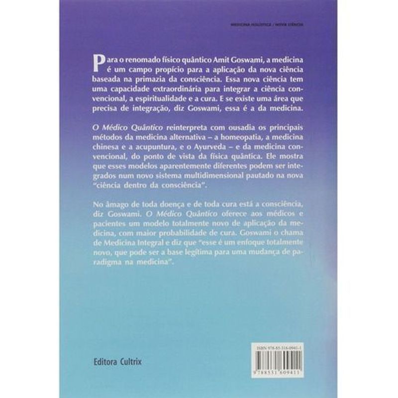 Para o renomado físico quântico Amit Goswami, a medicina é um campo propício para a aplicação da nova ciência baseada na primado da consciência. No âmago de toda doença e de toda cura está a consciência, diz ele. Esse livro oferece aos médicos e pacientes um modelo totalmente novo de aplicação da medicina, com maior probabilidade de cura. Goswami o chama de Medicina Integral e diz que “esse é um enfoque totalmente novo, que pode ser a base legítima para uma mudança de paradigma na medicina”.