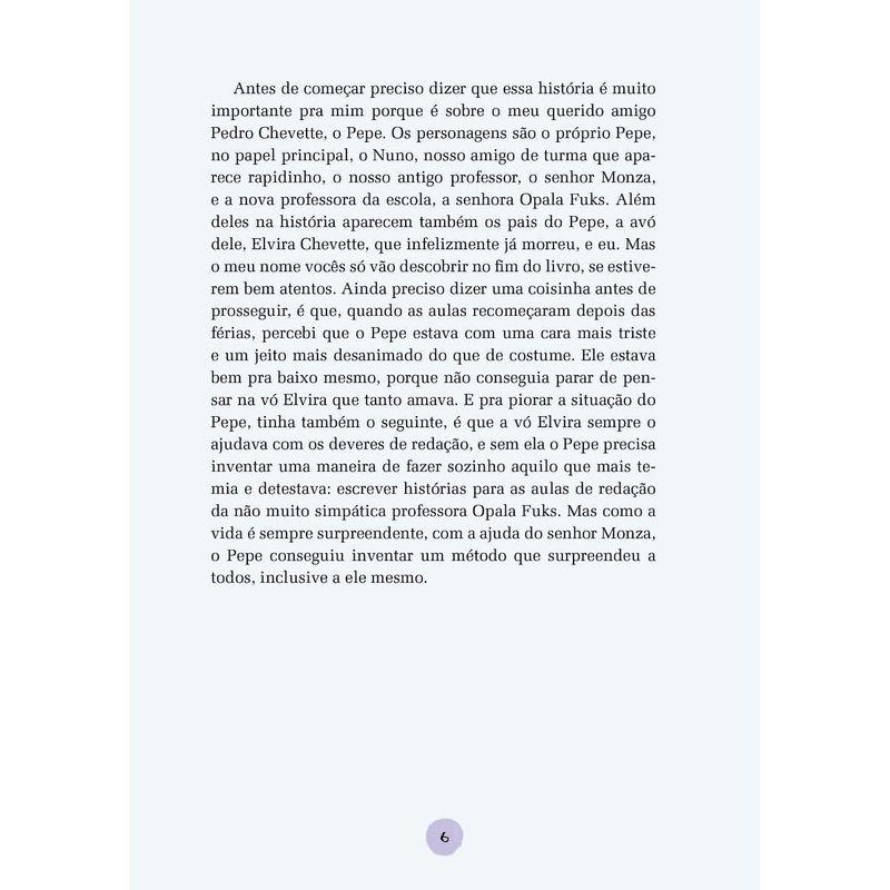 O método de Pepe Chevette conta a história de Pedro Chevette, o Pepe. Quem a narra é um amigo, ou uma amiga de Pepe, que o conhece bastante bem. No início do livro não sabemos se o narrador é uma menina ou menino. Os personagens são o próprio Pepe, no papel principal, o Professor Monza, antigo professor da turma, e a nova professora da escola, a senhora Opala Fuks. Além deles, na história aparecem também os pais do Pepe e a avó dele, Elvira Chevette, que infelizmente já morreu. A ação se inicia quando as aulas recomeçaram depois das férias. Pepe está muito triste pela morte da avó, de quem era bem próximo, e se apavora quando a nova professora pede à turma que escreva uma redação. Pepe entra em pânico e parte à procura de um método pessoal que lhe permita dar conta da tarefa.