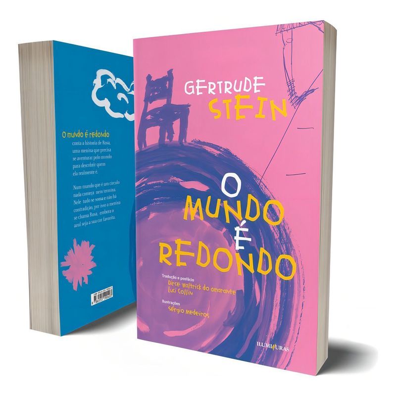 ORELHAS REDONDAS AZUIS DE ROSA Isso que você está lendo está nas partes de um livro chamadas de orelhas porque ficam cada uma de um lado do livro e geralmente podem ser abertas e ficar mais pra fora da cabeça onde está o livro mesmo. Essa escritora de cem anos atrás parece que é do futuro. A Gertrude já era adulta quando escreveu este livro sobre uma menina chamada Rosa que gostava mesmo era de azul como se fosse criança: foi colocando palavras uma depois da outra como se estivesse fazendo bolinhos de areia na praia, fazendo um colar de conchinhas. Ela brincou de escrever uma história para crianças como uma criança brinca: sem querer saber se tinha um jeito certo de fazer um livro. Repetindo as palavras e frases quantas vezes a Rosa quis. Contando como se estivesse cantando e inventando a melodia e a letra na hora. Dá para ver que ela se divertiu e acho que você também pode se divertir divertir divertir com esta história para crianças de todas as idades. A Dirce e a Luci ajudaram porque traduziram este livro sem deixar que se perdesse nem um pouco da graça, as surpresas, os experimentos, as invenções e a originalidade do original em inglês. Flávio de Souza