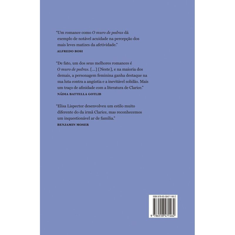 Neste premiado romance, Elisa Lispector rompe com os estereótipos de mulher ao discutir de forma original temas como divórcio, maternidade e relações familiares. Temos aqui o romance mais emblemático de Elisa Lispector. Publicado em 1963, O muro de pedras rapidamente angariou críticas elogiosas de alguns dos grandes intelectuais de seu tempo e conquistou prêmios relevantes como o Coelho Neto, da Academia Brasileira de Letras. Neste grande monólogo, conhecemos Marta, uma mulher em conflito que se tornou refém de seu casamento tedioso e de sua complexa relação com a mãe. Para se ver livre de sua rotina aprisionante, ela pede o divórcio, sem contar, porém, que tamanha liberdade a levaria à paralisia. Frustrada, Marta traça então um novo plano: se isolar no sítio da família e se tornar mãe. Elisa Lispector apresenta com originalidade e maestria a angústia de uma mulher que, desejando encontrar sua autonomia, caminha em direção ao próprio isolamento. A partir dos ciclos de recomeços de Marta, esta poderosa narrativa aborda temas considerados difíceis, como o desamparo, a solidão e a liberdade, mas que constituem o cerne dos sentimentos humanos. A presente edição conta com apresentação inédita de Nádia Battella Gotlib – escritora e biógrafa da irmã Lispector mais nova, Clarice –, além de prefácio de Jeferson Alves Masson – especialista na obra de Elisa Lispector. “Elisa Lispector desenvolveu um estilo muito diferente do da irmã Clarice, mas reconhecemos um inquestionável ar de família.” — Benjamin Moser “Um romance como O muro de pedras dá exemplo de notável acuidade na percepção dos mais leves matizes da afetividade.” — Alfredo Bosi “De fato, um dos seus melhores romances é O muro de pedras. […] [Neste], e na maioria dos demais, a personagem feminina ganha destaque na sua luta contra a angústia e a inevitável solidão. Mais um traço de afinidade com a literatura de Clarice.” — Nádia Battella Gotlib
