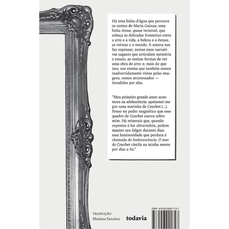 Há uma linha-d’água que percorre os contos de María Gainza; uma linha tênue que esboça as delicadas fronteiras entre a arte e a vida, a beleza e o êxtase, as retinas e o mundo. A autora nos faz repensar, nestas onze narrativas sagazes que articulam memória e ensaio, as muitas formas de ver uma obra de arte; e, mais do que isso, nos ensina que também somos inadvertidamente vistos pelas imagens, somos atravessados — invadidos por elas.