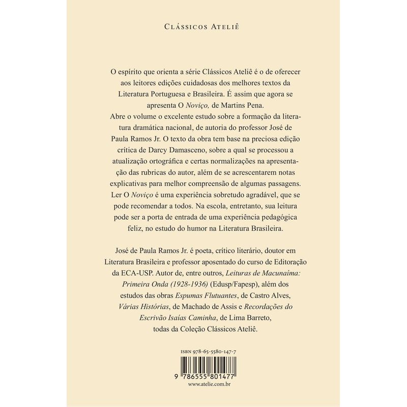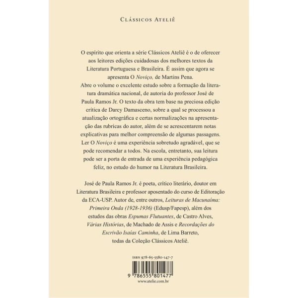 Obra-prima de Martins Pena, a comédia de costumes O Noviço estreou nos palcos em 1845. Narra as tramoias de um malandro que se casa duas vezes e tenta usurpar o dinheiro das esposas. A trama produz um retrato da sociedade carioca no período e ilustra o gosto médio dos frequentadores de teatro de então. Com texto leve e tipos comuns do imaginário brasileiro, aplica os princípios do ensinamento pelo humor, criticando a mentira e a fraude. Prefácio e Notas: José de Paula Ramos Jr. Ilustrações: Arnaldo Melo Coleção Clássicos Ateliê