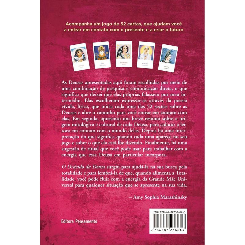 Com mais de 150 mil exemplares vendidos, este clássico chega agora em caixa rígida. O livro celebra as muitas faces com as quais a Deusa foi adorada em culturas de todo mundo. O Oráculo da Deusa reúne 52 cartas que representam um aspecto particular da energia feminina e foi criado para dar fácil acesso aos conhecimentos sobre as Deusas e seus significados simbólicos, ligados ao Sagrado Feminino. Por meio de uma combinação dinâmica de poesia, mitologia e rituais, este livro responde a diversas perguntas, além de oferecer conhecimentos intuitivos e orientações para encarar os desafios do dia a dia. Um oráculo que ajuda você a entrar em contato com o presente e a criar o futuro que sempre desejou.