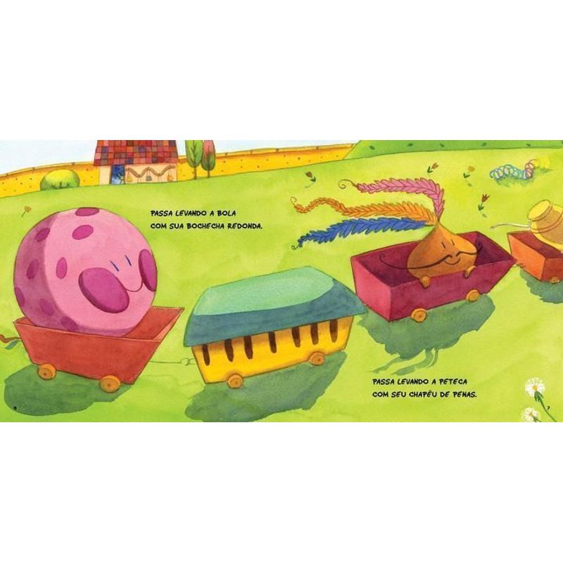Esse livro retrata algo comum no cotidiano das crianças: um gostoso dia de sol, propício para muitas brincadeiras. Contudo, os personagens são os próprios brinquedos – tanto atuais como tradicionais, como uma peteca e uma boneca de pano – que interagem a partir da passagem de um trenzinho pelo jardim da escola. As frases simples acompanham o movimento do trem, dando noções de movimento rápido e lento; as ilustrações coloridas estimulam o leitor iniciante e criam a atmosfera de um caloroso dia de sol.