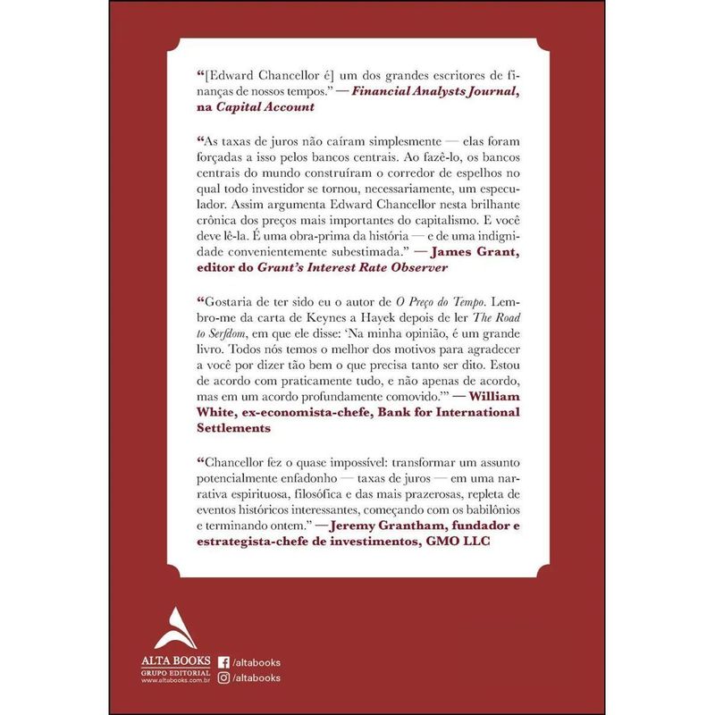 “[Edward Chancellor é] um dos grandes escritores de finanças de nossos tempos.” — Financial Analysts Journal, na Capital Account “As taxas de juros não caíram simplesmente — elas foram forçadas a isso pelos bancos centrais. Ao fazê-lo, os bancos centrais do mundo construíram o corredor de espelhos no qual todo investidor se tornou, necessariamente, um especulador. Assim argumenta Edward Chancellor nesta brilhante crônica dos preços mais importantes do capitalismo. E você deve lê-la. É uma obra-prima da história — e de uma indignidade convenientemente subestimada.” — James Grant, editor do Grant’s Interest Rate Observer “Gostaria de ter sido eu o autor de O Preço do Tempo. Lembro-me da carta de Keynes a Hayek depois de ler The Road to Serfdom, em que ele disse: ‘Na minha opinião, é um grande livro. Todos nós temos o melhor dos motivos para agradecer a você por dizer tão bem o que precisa tanto ser dito. Estou de acordo com praticamente tudo, e não apenas de acordo, mas em um acordo profundamente comovido.’” — William White, ex-economista-chefe, Bank for International Settlements “Chancellor fez o quase impossível: transformar um assunto potencialmente enfadonho — taxas de juros — em uma narrativa espirituosa, filosófica e das mais prazerosas, repleta de eventos históricos interessantes, começando com os babilônios e terminando ontem.” — Jeremy Grantham, fundador e estrategista-chefe de investimentos, GMO LLC
