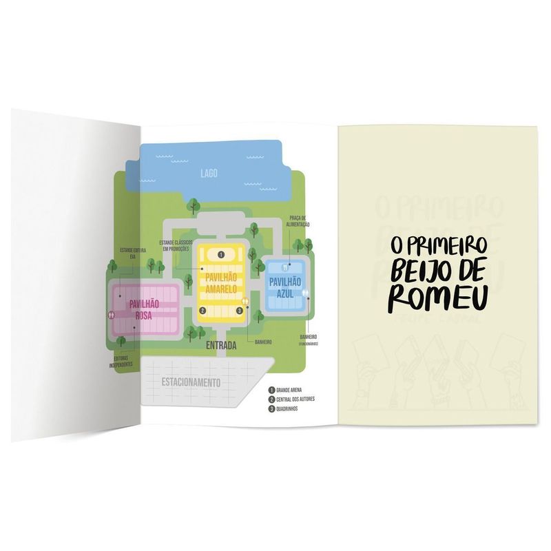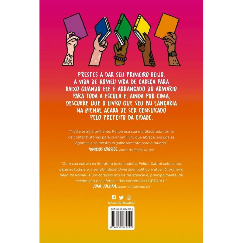 “Romeu está prestes a beijar pela primeira vez. E tudo seria perfeito, se não fosse por um colega de turma querendo arranjar confusão e um Prefeito… Sesível e potente, O primeiro beijo de Romeu é o primeiro romance jovem adulto do premiado roteirista Felipe Cabral. Rio de Janeiro, 2019: Romeu está prestes a dar o seu primeiro beijo! Entre estantes e mais estantes de livros na biblioteca da escola, o mundo, para ele, começou a adquirir uma velocidade diferente. Ele está quase lá… até que não está mais. Seu quase primeiro beijo escapa antes mesmo de se tornar realidade quando subitamente, à força, é arrancado do armário para o colégio inteiro. Agora, tudo parece correr rápido demais. Mas, para amenizar os obstáculos do mundo lá fora, Romeu tem ao seu lado uma verdadeira rede de apoio na forma de uma trupe implacável, a começar pela sua companheira inseparável, a divertidíssima Julinha, sua melhor amiga, e, claro, seus pais coruja Tim e Samuca. É então que, ainda tentando entender o que aconteceu na escola, outra surpresa desagradável: o livro de seu pai, com lançamento previsto para o dia seguinte na concorrida Bienal do Livro, acaba de ser censurado por ninguém mais, ninguém menos do que o Prefeito da cidade. Respira, Romeu! Em meio a incertezas, descobertas, um sorriso de canto e uma incontestável chamada à luta, esse fim de semana está longe de ser sossegado. E tudo está só começando. “Leve e profundo ao mesmo tempo, tão bem-humorado quanto sério, Felipe faz um golaço e esfrega na cara de todo mundo o que já devia estar mais óbvio que água: amor é para ser celebrado. Sempre.” – Thalita Rebouças “Com sua estreia na literatura jovem adulta, Felipe Cabral coloca na página toda a sua sensibilidade! Divertido, político e atual, O primeiro beijo de Romeu é um corajoso ato de resistência e, principalmente, de celebração dos afetos e das existências LGBTQIA+.” – Juan Jullian “Se todos os garotos tivessem a chance de ler a história de Romeu ainda na adolescência, milhares de armários estariam vazios.” – Stefano Volp, autor de Homens pretos (não) choram “Nesta estreia brilhante, Felipe usa sua multifacetada forma de contar histórias para criar um livro que abraça, enxuga as lágrimas e se mostra orgulhosamente para o mundo.” – Vinícius Grossos, autor de Feitos de sol “