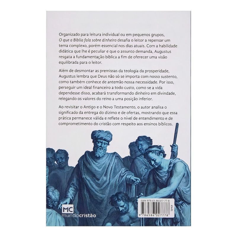 Organizado para leitura individual ou em pequenos grupos, O que a Bíblia fala sobre dinheiro desafia o leitor a repensar um tema complexo, porém essencial nos dias atuais. Com a habilidade didática que lhe é peculiar e que o assunto demanda, Augustus resgata a fundamentação bíblica a fim de oferecer uma visão equilibrada para o leitor. Além de desmontar as premissas da teologia da prosperidade, Augustus lembra que Deus não só se importa com nosso sustento, como também conhece de antemão nossa necessidade. Por isso, perseguir um ideal financeiro a todo custo, como se a vida dependesse disso, acabará transformando dinheiro em divindade, relegando os valores do reino a uma posição inferior. Revisitando o Antigo e o Novo Testamento, o autor analisa o significado da entrega do dízimo e de ofertas, mostrando que essa prática permanece válida e reflete o nível de entendimento e de comprometimento do cristão relativamente aos ensinos bíblicos.