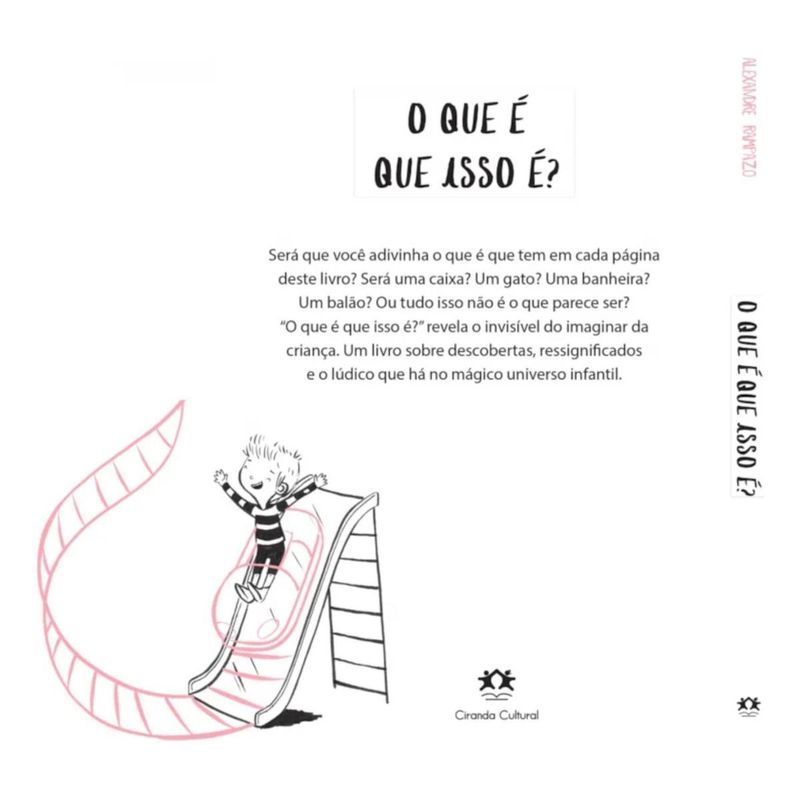 Será que você adivinha o que é que tem em cada página deste livro? Será uma caixa? Um gato? Uma banheira? Um balão? Ou tudo isso não é o que parece ser? O que é que isso é? revela o invisível do imaginar da criança. Um livro sobre descobertas, significância e o lúdico que há no mágico universo infantil.