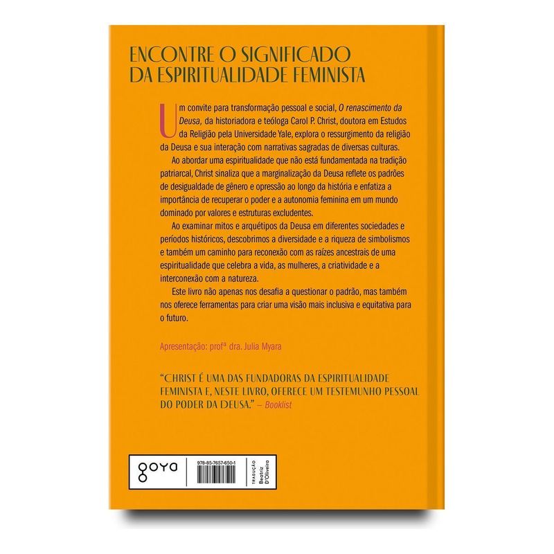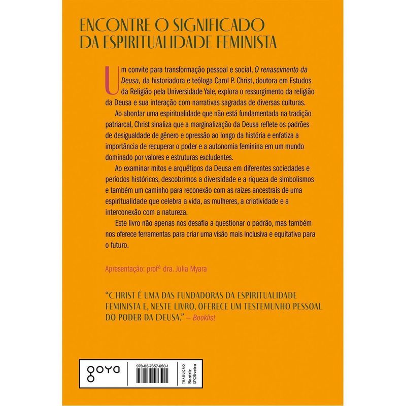 Examinando mitos e arquétipos da Deusa em diferentes sociedades, descobrimos como Sua marginalização reflete os padrões de desigualdade de gênero e opressão ao longo da história.Ao abordar uma espiritualidade que não está fundamentada na tradição patriarcal, a historiadora e teóloga Carol P. Christ, doutora em Estudos da Religião pela Universidade Yale, retorna a cosmovisão ancestral que celebra a vida, as mulheres, a criatividade e a interconexão com a natureza.Após décadas de pesquisa, a autora demonstra porque essa tealogia — o estudo e a reflexão sobre o divino a partir de uma perspectiva feminina — precisa estar atrelada a uma vivência diária, e nos ensina como implementar pensamentos e práticas religiosas centradas na Deusa.Um livro fundamental para todos que querem entender o caminho histórico percorrido por uma religião que liga mente-espírito e enxerga no futuro uma possibilidade de paz e harmonia que só é possível através da conexão com o feminino.“Encontramos na Deusa uma imagem irrefutável de poder feminino, uma visão da conexão profunda entre todos os seres na teia da vida, e um chamado a criar paz na Terra. O retorno da Deusa nos inspira a ter esperança de curar as profundas fissuras entre mulheres e homens, entre ‘o homem’ e a natureza, e entre ‘Deus’ e o mundo, que há muito tempo moldam nossa visão ocidental da realidade.” — Carol P. Christ em O renascimento da Deusa