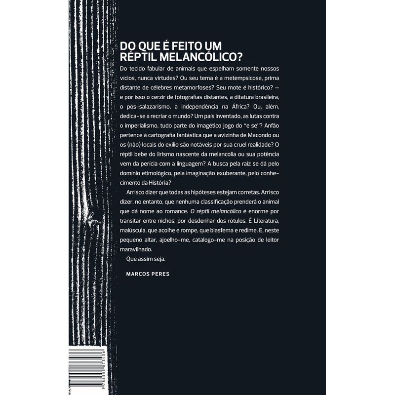 “Livro vencedor do Prêmio Sesc de Literatura 2021 na categoria Romance. O réptil melancólico, romance de estreia de Fábio Horácio-Castro, conta uma realidade alternativa, em que o estado do Pará permaneceu colônia portuguesa até os anos 1960. Quando a Ditadura Militar, após negociar com Portugal, toma o controle da colônia paraense, alguns personagens são forçados a saírem de Belém e se exilarem em busca de segurança. O livro narra o retorno de Felipe para sua cidade após o longo período de exílio, levado por sua mãe, perseguida e torturada pelo regime militar brasileiro. No seu retorno, Felipe restabelece contato com a família paterna, especialmente com o primo Miguel, que está partindo da cidade. Nesta história de repressão, retorno e fuga, os dois primos vivem exílios opostos. Segundo a poeta e ficcionista Luci Collin, que assina a orelha do livro, “O réptil melancólico nos enseja um mundo de percepções inegavelmente corajosas e necessárias.”. Já para o romancista Marcos Peres, que assina a quarta capa, “[A obra] é enorme por transitar entre nichos, por desdenhar dos rótulos. É Literatura, maiúscula, que acolhe e rompe, que blasfema e redime. E, neste pequeno altar, ajoelho-me, catalogo-me na posição de leitor maravilhado”. “