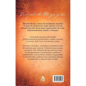 Rhonda Byrne, autora do fenômeno mundial O Segredo, demonstra como aplicar a lei da atração nas três áreas mais importantes da vida: relacionamentos, saúde e finanças. Você pode alcançar felicidade, relacionamentos gratificantes, saúde, riqueza e sucesso. Este livro vai mostrar como. Por meio de lições, conselhos e histórias reais de pessoas que usaram O Segredo para mudar sua vida, Rhonda Byrne mostra como os pensamentos e sentimentos positivos, combinados com práticas diárias de gratidão e visualização, podem levar qualquer pessoa a conquistar a vida de seus sonhos.