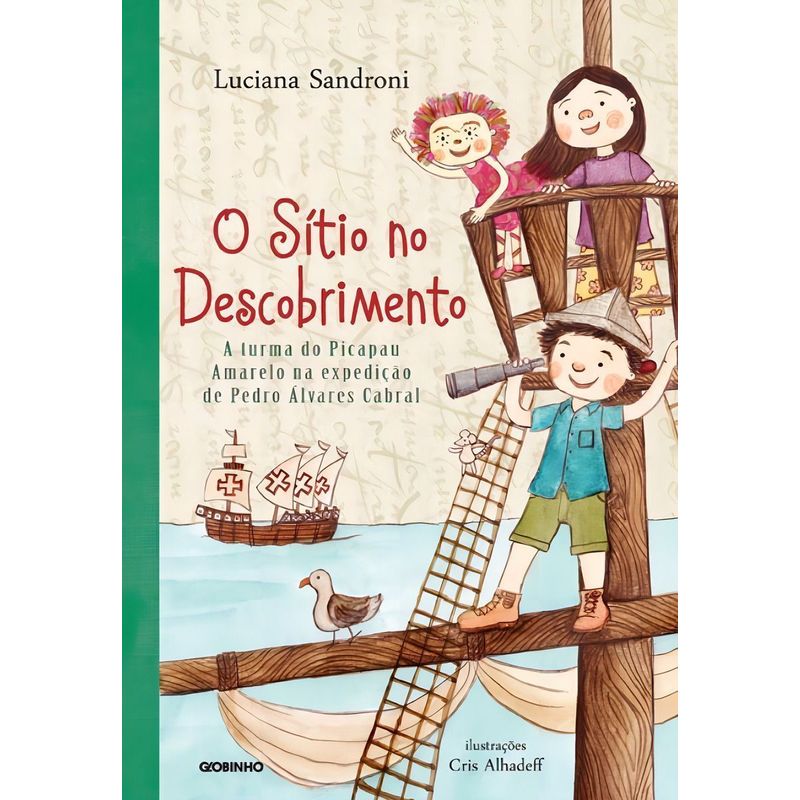 Bem-sucedido do ponto de vista literário – e também pelo conteúdo paradidático, com sua abordagem que bebe de confiáveis fontes históricas sem abrir mão do bom humor e da leveza –, O Sítio no descobrimento fez sucesso. Esgotado nas livrarias, o título, que foi publicado pela primeira vez há doze anos como parte das celebrações pelos 500 anos do descobrimento do Brasil, ganha agora nova edição pelo selo Globinho, com texto revisado e atualizado pela premiada autora infantil Luciana Sandroni e novo projeto gráfico com ilustrações inéditas de Cris Alhadeff. Admiradora e estudiosa da obra de Monteiro Lobato, a autora Luciana Sandroni criou no livro uma narrativa que respeita as características dos personagens do Sítio do Picapau Amarelo. A autora baseou-se em pesquisas de historiadores modernos para contar como aconteceu o Descobrimento do Brasil, conciliando as versões comumente explicadas em sala de aula com dúvidas trazidas por pesquisas paralelas. Em O Sítio no descobrimento, Pedrinho chega ao Sítio do Picapau Amarelo para passar as férias escolares. Mas o menino parece um tanto esquisito. Em vez de se aventurar pela mata de bodoque na mão, o garoto passa os dias estudando na biblioteca da avó. Instigado pelo que aprendeu na escola, mas confuso com as informações desencontradas que pesquisou nos livros, Pedrinho está cismado: afinal, qual é a verdadeira história do descobrimento do Brasil? Cabral veio parar aqui por acaso ou de propósito? Se já havia índios vivendo nestas terras, então por que se fala em “descobrimento” e não em “invasão”? Cabe a Emília propor um jeito de obter todas as respostas: usar o pó de pirlimpimpim para voltar ao passado e participar da expedição portuguesa que chegou primeiro às praias brasileiras. Este é o ponto de partida para as aventuras de O Sítio no descobrimento.