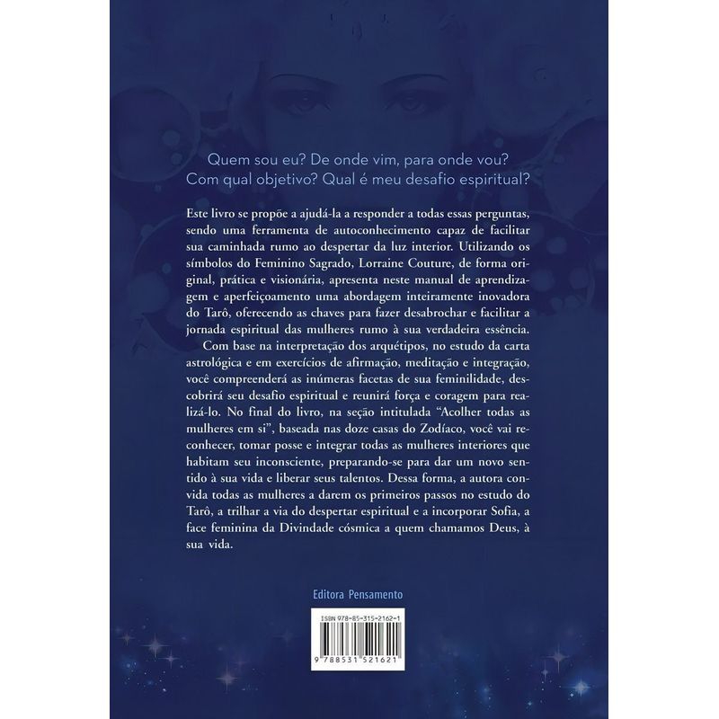 Este livro é uma ferramenta de autoconhecimento capaz de facilitar sua caminhada rumo ao despertar da luz interior. Utilizando os símbolos do Feminino Sagrado, Lorraine Couture, apresenta uma abordagem inteiramente inovadora do Tarô, oferecendo as chaves para fazer desabrochar e facilitar a jornada espiritual das mulheres rumo à sua verdadeira essência. Com base na interpretação dos arquétipos, no estudo da carta astrológica e em exercícios de afirmação, meditação e integração, você compreenderá as inúmeras facetas de sua feminilidade, descobrirá seu desafio espiritual e reunirá força e coragem para realizá-lo. Dessa forma, a autora convida você a dar os primeiros passos no estudo do Tarô, a trilhar a via do despertar espiritual e a incorporar Sofia, a face feminina da Divindade cósmica a quem chamamos Deus, à sua vida.