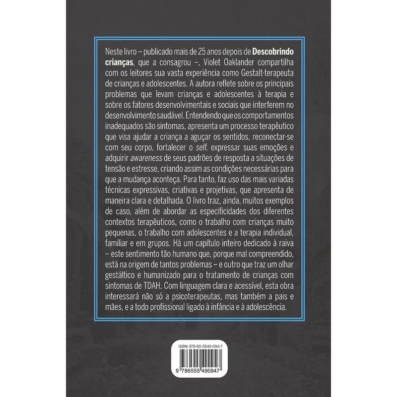 Neste livro – publicado mais de 25 anos depois de Descobrindo crianças, que a consagrou –, Violet Oaklander compartilha com os leitores sua vasta experiência como Gestalt-terapeuta de crianças e adolescentes. A autora reflete sobre os principais problemas que levam crianças e adolescentes à terapia e sobre os fatores desenvolvimentais e sociais que interferem no desenvolvimento saudável. Entendendo que os comportamentos inadequados são sintomas, apresenta um processo terapêutico que visa ajudar a criança a aguçar os sentidos, reconectar-se com seu corpo, fortalecer o self, expressar suas emoções e adquirir awareness de seus padrões de resposta a situações de tensão e estresse, criando assim as condições necessárias para que a mudança aconteça. Para tanto, faz uso das mais variadas técnicas expressivas, criativas e projetivas, que apresenta de maneira clara e detalhada. O livro traz, ainda, muitos exemplos de caso, além de abordar as especificidades dos diferentes contextos terapêuticos, como o trabalho com crianças muito pequenas, o trabalho com adolescentes e a terapia individual, familiar e em grupos. Há um capítulo inteiro dedicado à raiva – este sentimento tão humano que, porque mal compreendido, está na origem de tantos problemas – e outro que traz um olhar gestáltico e humanizado para o tratamento de crianças com sintomas de TDAH. Com linguagem clara e acessível, esta obra interessará não só a psicoterapeutas, mas também a pais e mães, e a todo profissional ligado à infância e à adolescência.