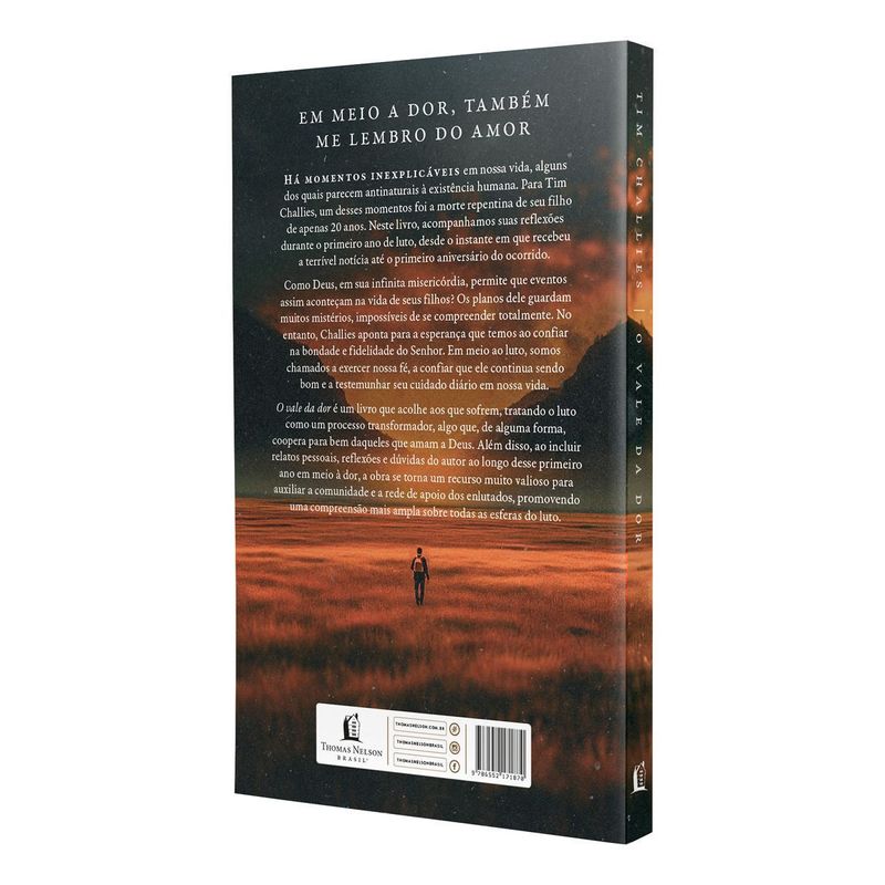 Em meio a dor, também me lembro do amorHá momentos inexplicáveis em nossa vida, alguns dos quais parecem antinaturais à existência humana. Para Tim Challies, um desses momentos foi a morte repentina de seu filho de apenas 20 anos. Neste livro, acompanhamos suas reflexões durante o primeiro ano de luto, desde o instante em que recebeu a terrível notícia até o primeiro aniversário do ocorrido Deus, em sua infinita misericórdia, permite que eventos assim aconteçam na vida de seus filhos?Os planos de Deus guardam muitos mistérios, impossíveis de compreender totalmente nesta vida. No entanto, Challies aponta para a esperança que temos ao confiar na bondade e fidelidade do Senhor. Em meio ao luto, somos chamados a exercer nossa fé, a confiar que ele continua sendo bom e a testemunhar seu cuidado diário em nossa vida.O vale da dor é um livro que acolhe aos que sofrem, tratando o luto como um processo transformador, algo que, de alguma forma, coopera para bem daqueles que amam a Deus (Romanos 8:28). Além disso, ao incluir relatos pessoais, reflexões e dúvidas do autor ao longo desse primeiro ano, a obra se torna um recurso muito valioso para auxiliar a comunidade e a rede de apoio dos enlutados, promovendo uma compreensão mais ampla sobre todas as esferas do luto.