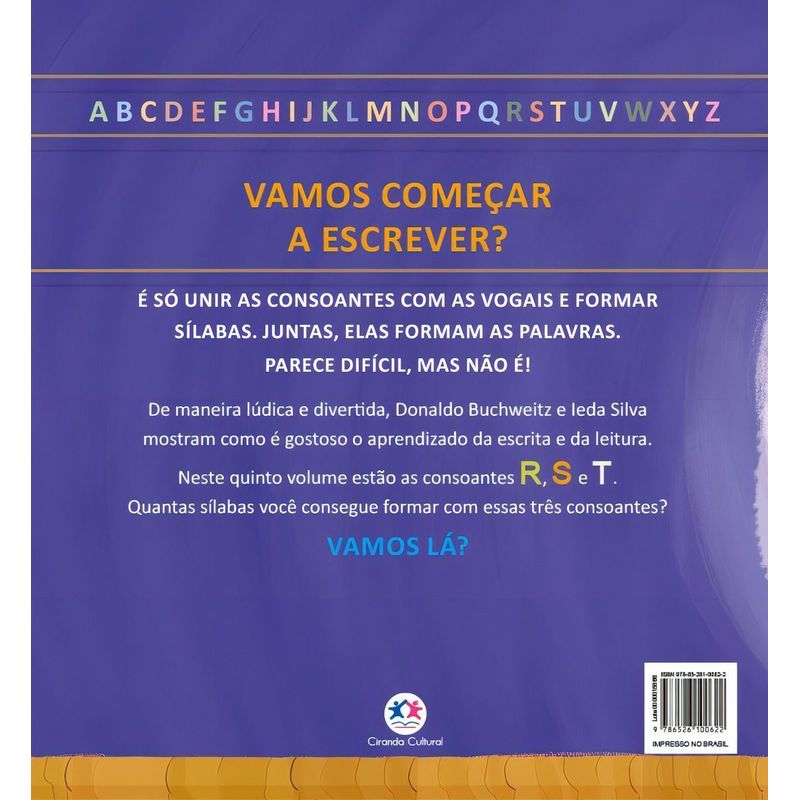 Vamos começar a escrever? É só unir as consoantes com as vogais e formar sílabas. Juntas, elas formam as palavras. Parece difícil, mas não é! De maneira lúdica e divertida, Donaldo Buchweitz e Ieda Silva mostram como é gostoso o aprendizado da escrita e da leitura. Neste quinto volume estão as consoantes R, S e T. Quantas sílabas você consegue formar com essas três consoantes? Vamos lá?
