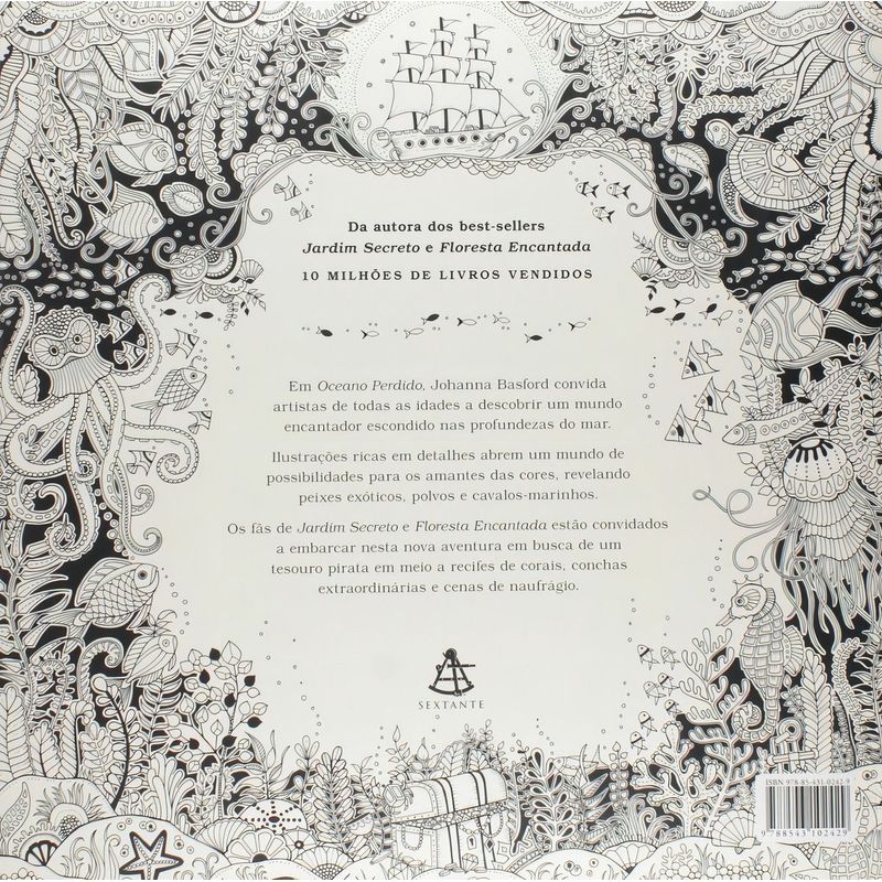 O novo livro da autora de Jardim secreto e Floresta encantada, 10 milhões de exemplares vendidos em todo o mundo. Em Oceano perdido, Johanna Basford convida artistas de todas as idades a descobrir um mundo encantador escondido nas profundezas do mar. Ilustrações ricas em detalhes vão revelar peixes exóticos, polvos e cavalos-marinhos, abrindo um mundo de possibilidades para os amantes das cores e das tintas. Os fãs de Jardim secretoe Floresta encantadaestão convidados para embarcar nesta nova aventura em busca de um tesouro pirata em meio a recifes de corais, conchas extraordinárias e cenas de naufrágio.