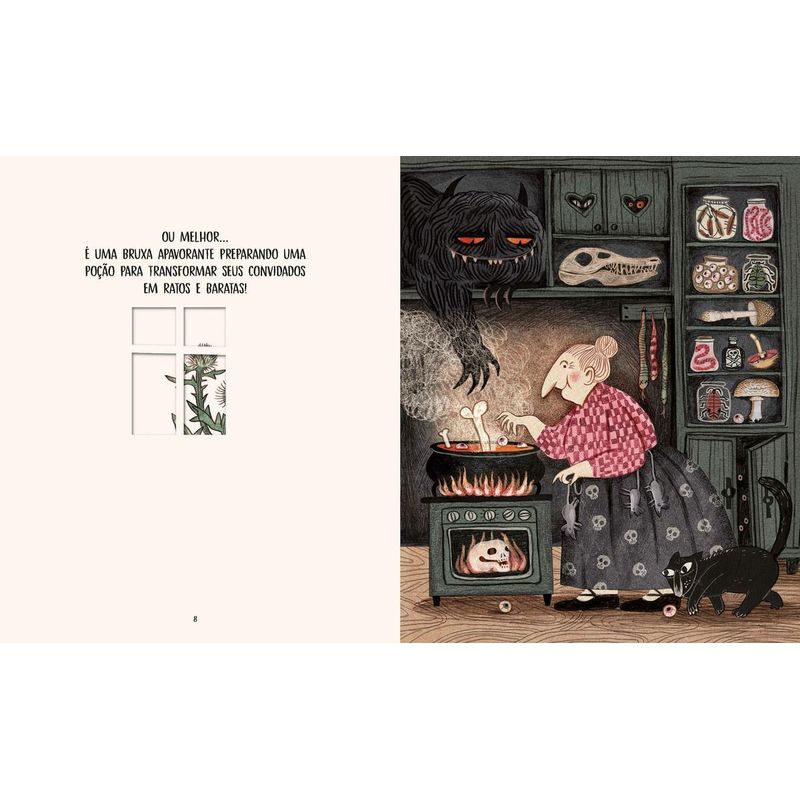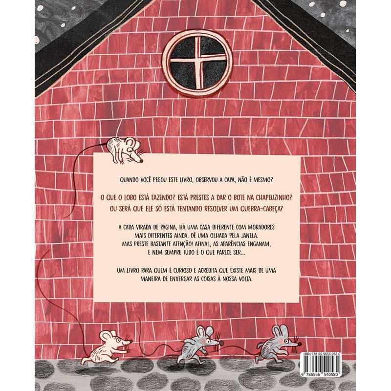Espie pela janela da casa do lobo, do urso e até mesmo do dragão. Mas tome cuidado, pois nada é o que parece ser! Divertida e cheia de surpresas, essa obra é para pessoas curiosas que sempre querem saber um pouco mais. Neste livro interativo, a premiada autora e ilustradora Katerina Gorelik usa de todos os artifícios para brincar com a imaginação dos leitores, mostrando que há não apenas uma, mas várias maneiras de enxergar as coisas à nossa volta. A cada virada de página, há uma casa diferente com moradores mais diferentes ainda: bruxas, ratos, morcegos e até alguns personagens clássicos da literatura infantil, como a Chapeuzinho Vermelho e os Sete Cabritinhos. Logo no início da obra, vemos a fachada de uma casa e, de sua janela, o perfil de uma simpática senhora. Porém, ao passar a página, percebemos que na verdade a “simpática senhora” é uma bruxa apavorante que prepara uma poção para transformar seus convidados em baratas! Para criar esse curioso e instigante jogo com a percepção dos leitores, Gorelik transforma as janelas em espaços de imaginação e possibilidades. Indicado para leitores a partir de 3 anos.