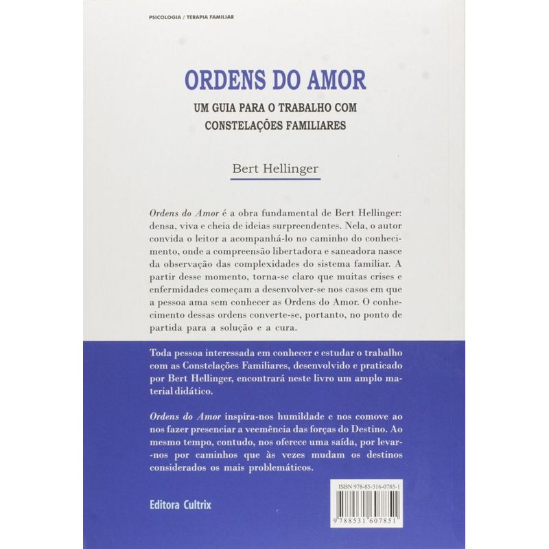 “Ordens do Amor” é a obra fundamental de Bert Hellinger: densa, viva e cheia de idéias surpreendentes. Nela, o autor convida o leitor a acompanhá-lo no caminho do conhecimento, onde a compreensão libertadora e saneadora nasce da observação das complexidades do sistema familiar. A partir desse momento, torna-se claro que muitas crises e enfermidade começam a desenvolver-se nos casos em que a pessoa ama sem conhecer as Ordens do Amor. O conhecimento dessas ordens converte-se, portanto, no ponto de partida para a solução e a cura. “Ordens do Amor” inspira-nos humildade e nos comove ao nos fazer presenciar a veemência das forças do Destino. Ao mesmo tempo, contudo, nos oferece uma saída, por levar-nos por caminhos que as vezes mudam os destinos considerados os mais problemáticos.