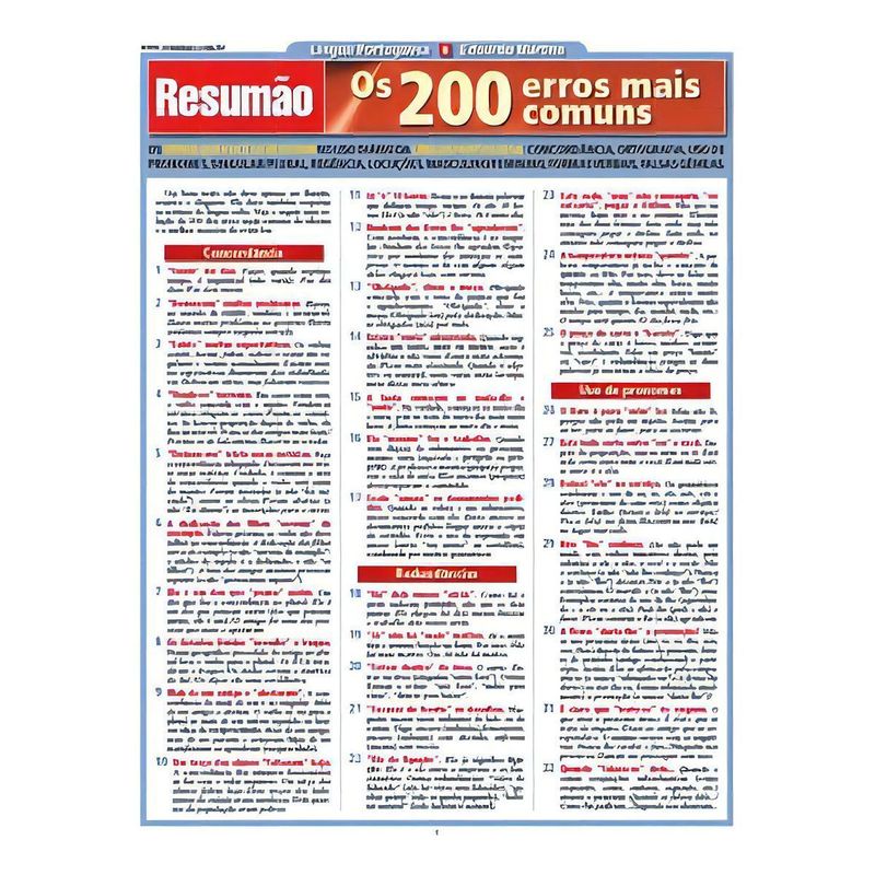 O Resumão Os 200 Erros Mais Comuns é um guia prático que enumera os erros que você deve evitar no uso diário da língua portuguesa. Erros de concordância, redundâncias, uso de pronomes, singular e plural. Os erros mais frequentes de ortografia, de acentuação e do uso do hífen. Erros de regência, o uso incorreto de locuções e as falsas gêmeas. As formas verbais, masculino e feminino. Palavras mal-usadas e o uso da crase. Destaque para uma lista de 14 erros que você deve evitar a todo custo. Atualizado de acordo com as novas regras de ortografia.