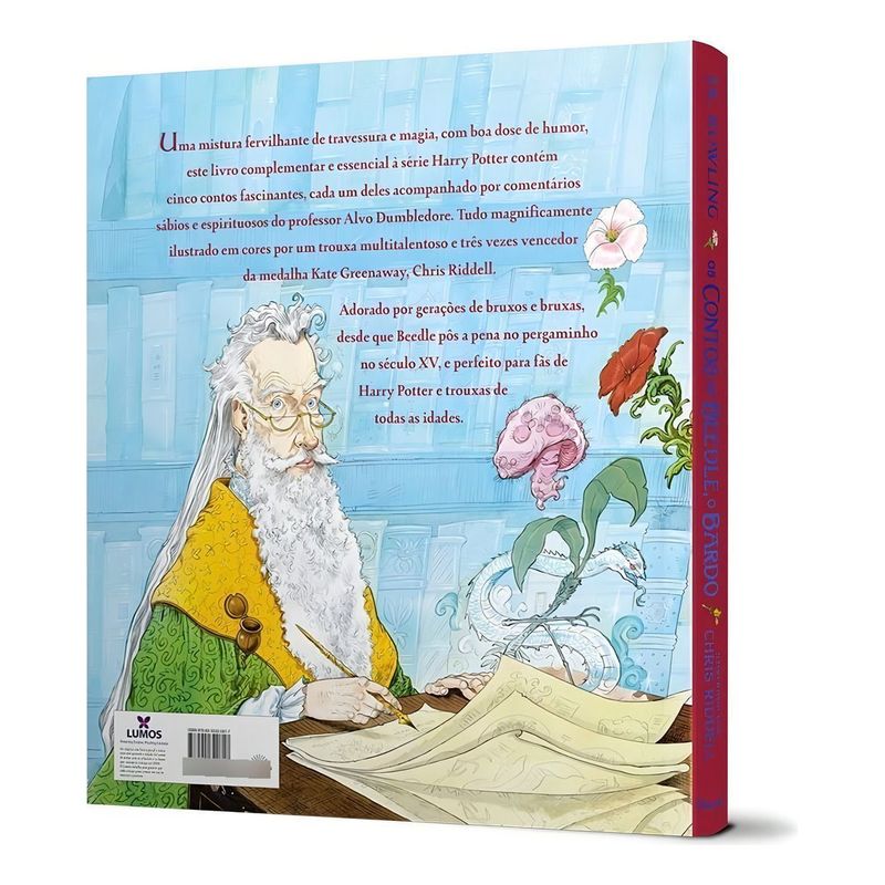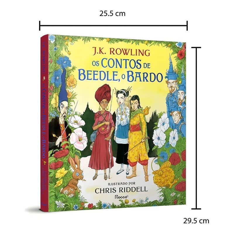Os contos de Beedle, o Bardo – Edição Ilustrada. Um presente mágico para todos os fãs de Harry Potter, Os Contos de Beedle, o Bardo ganha edição de luxo, totalmente ilustrada pelo talentosíssimo Chris Riddell! Repleto de imagens coloridas e fascinantes, o livro segue o padrão das edições ilustradas de Harry Potter Animais fantásticos e Quadribol através dos séculos. Citado em Harry Potter e as Relíquias da Morte como um presente deixado pelo mestre Alvo Dumbledore para Hermione Granger, Os contos de Beedle, o Bardo reúne cinco contos populares para jovens bruxos e bruxas. Como J.K. Rowling explica na apresentação do livro, pouco se sabe do passado de seu autor, apenas que Beedle, o Bardo, teria nascido em Yorkshire no século XV, possuía uma longa barba e que suas histórias foram passadas de geração em geração por pais bruxos para seus filhos, da mesma forma que os contos e fábulas escritos para pequenos trouxas. O livro, traduzido das runas originais pela personagem Hermione, a partir do velho exemplar herdado por ela, traz comentários e notas do professor Alvo Dumbledore. São reminiscências do mestre que revelam muitas curiosidades sobre sua fascinante personalidade e o passado de Hogwarts. A primeira das histórias, “O bruxo e o caldeirão saltitante”, tem como protagonista o filho de um bruxo muito bom que, após a morte do pai, decide não ajudar os outros como o pai o fazia; “A fonte da sorte” mostra a busca de três bruxas e um cavaleiro por uma fonte, cuja água concede boa sorte a todos aqueles que nela se banharem; em seguida, a mais assustadora das narrativas, “O coração peludo do mago”, sobre um velho bruxo incapaz de amar e uma donzela que em muito lembra as donzelas dos contos de fadas trouxas; em “O conto dos três irmãos”, Rowling apresenta as aventuras da esperta “Babbity, a coelha, e seu toco gargalhante”; já “O conto dos três irmãos” aparece na íntegra em Harry Potter e as Relíquias da Morte e é fundamental para o entendimento da trama. A edição é em capa dura, com fitilho e uma página quadrupla ilustrada.