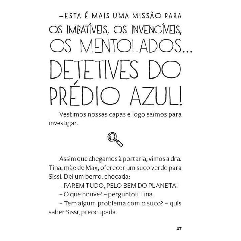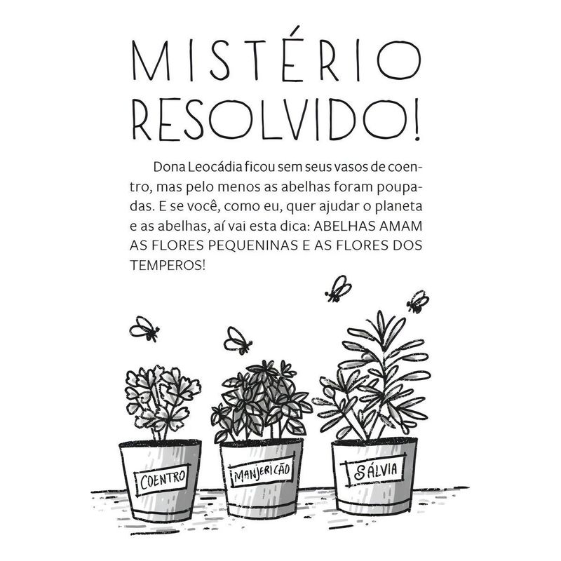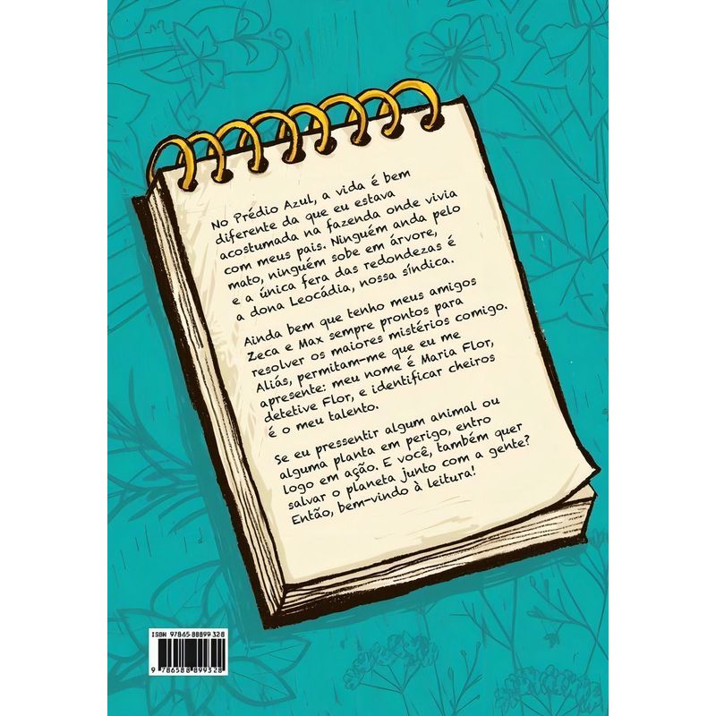 Coisas muito estranhas acontecem no Prédio Azul. Ainda bem que os moradores podem contar com os imbatíveis, os invencíveis, os inseparáveis… Detetives do Prédio Azul! No quarto volume da série, Flor, Zeca e Max se reúnem para resolver mistérios envolvendo plantas e animais. Os Detetives do Prédio Azul estão de volta! E dessa vez quem narra as histórias é a Detetive Flor, cujo principal talento é identificar os mais variados cheiros. Flor acaba de se mudar para o prédio, mas já conheceu de perto a fúria da síndica, dona Leocádia. Vinda de uma fazenda e acostumada a viver em contato muito próximo com a natureza, a nova moradora não se conforma quando algum animal ou alguma planta estão em perigo. Imagina então quando dona Leocádia resolve dar fim nas abelhas que aparecem no prédio? Entre sumiços de plantas, poções secretas, magia e muita diversão, Flor e seus amigos Zeca e Max estão sempre prontos para resolver qualquer mistério. Indicado para leitores a partir de 6 anos.