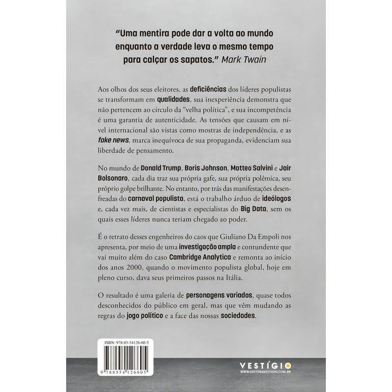 “Uma mentira pode dar a volta ao mundo no mesmo tempo que a verdade leva para calçar seus sapatos.” Mark Twain Aos olhos dos seus eleitores, as *deficiências* dos líderes populistas se transformam em qualidades, sua inexperiência demonstra que não pertencem ao círculo da “velha política”, e sua incompetência é uma garantia da sua autenticidade. As tensões que causam em nível internacional são vistas como mostras de sua independência, e as fake News, marca inequívoca de sua propaganda, evidenciam sua liberdade de pensamento. No mundo de Donald Trump, Boris Johnson, Matteo Salvini e Jair Bolsonaro, cada dia traz sua própria gafe, sua própria polêmica, seu próprio golpe brilhante. No entanto, por trás das manifestações desenfreadas do carnaval populista, está o trabalho árduo de ideólogos e, cada vez mais, de cientistas e especialistas do Big Data, sem os quais esses líderes nunca teriam chegado ao poder. É o retrato desses engenheiros do caos que Giuliano da Empoli nos apresenta, através de uma investigação ampla e contundente que vai muito além do caso Cambridge Analytica e remonta ao início dos anos 2000, quando o movimento populista global, hoje em pleno curso, dava seus primeiros passos na Itália. O resultado é uma galeria de personagens variados, quase todos desconhecidos do público em geral, mas que vêm mudando as regras do jogo político e a face das nossas sociedades.