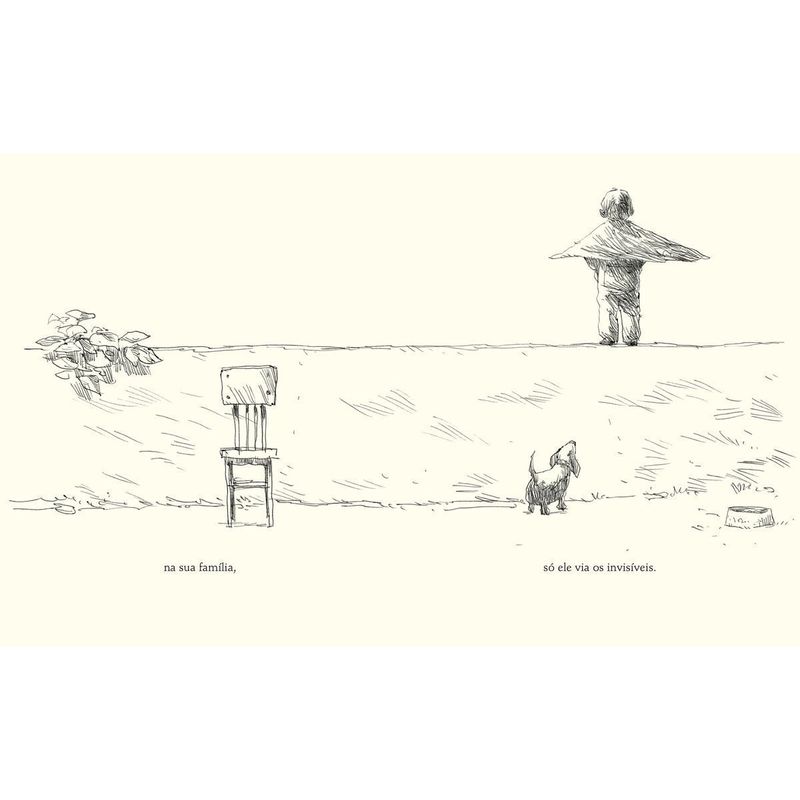 Neste livro ilustrado da renomada dupla Tino Freitas e Odilon Moraes, os leitores conhecerão a história de um menino com um superpoder — ele é capaz de ver os invisíveis. Um menino é o único em sua família com um superpoder: ele consegue ver os invisíveis. Em uma narrativa em que palavras e imagens se complementam e surpreendem, o leitor é convidado a refletir sobre personagens cotidianas muitas vezes ignoradas pelas pessoas adultas. Um idoso sentado em um banco de praça, a multidão do centro da cidade, pessoas em situação de rua, uma mulher no mercado de trabalho… Conforme o tempo passa, porém, o menino também vai se tornando adulto. O que acontecerá com seu poder? Livro indicado para leitores a partir de 6 anos.