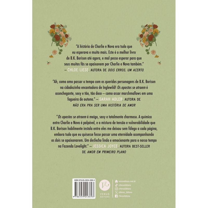 Duas pessoas muito diferentes decidem testar sua química em uma transa sem compromisso. Mas será que os opostos se atraem na Fazenda Lovelight? Nova Porter não está em busca de amor e certamente não consegue explicar sua atração pelo consultor de investimentos Charlie Milford. Talvez ser supercertinho seja o charme dele. Ou talvez seja a determinação em ajudá-la no seu novo negócio. De qualquer forma, Nova se distrai sempre que ele está por perto. Prestes a inaugurar um estúdio de tatuagem em sua cidade natal, Inglewild, ela não tem tempo para namorar. Em um esforço para tirar de vez Charlie da cabeça, Nova faz uma proposta a ele: uma noite sem compromisso. Assim eles podem acabar com a atração desconfortável e retornar a suas respectivas responsabilidades. Mas a noite explosiva que passam juntos acaba com as expectativas de encerrar o clima entre eles. Agora, com Charlie na cidade administrando temporariamente a Fazenda Lovelight, Nova não consegue evitá-lo. E Charlie? Bom, Charlie sabe reconhecer um ótimo investimento. Por isso ele espera convencer Nova de que vale um pouco do tempo dela. “A história de Charlie e Nova era tudo que eu esperava e muito mais. Este é o melhor livro de B.K. Borison até agora, e mal posso esperar para que seus muitos fãs se apaixonem por Charlie e Nova também.” — Chloe Liese, autora de Dois erros, dois acertos “Ah, como amo passar o tempo com os queridos personagens de B.K. Borison na pequena cidade encantadora de Inglewild! Os opostos se atraem é aconchegante, quente e tão, tão doce — como assar marshmallows em uma fogueira de outono.” — Sarah Adler, autora de Não era pra ser uma história de amor “Os opostos se atraem é meigo, sexy e totalmente charmoso. A química entre Charlie e Nova é palpável, e a mistura de tensão e vulnerabilidade que B.K. Borison habilmente instaura entre eles me deixou sem fôlego a cada página, embora tudo que eu quisesse fosse passar uma eternidade vendo os dois se apaixonarem. Um desfecho lindo e emocionante para nosso tempo na Fazenda Lovelight.” — Jessica Joyce, autora best-seller de Amor em primeiro plano