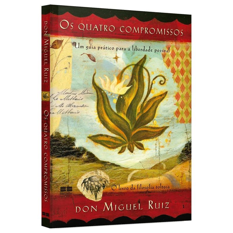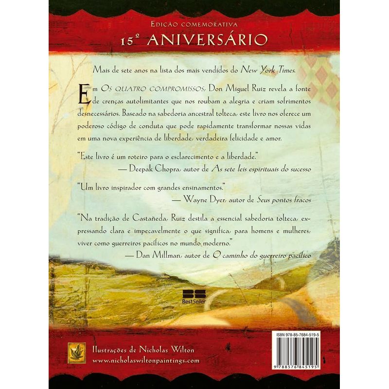 “Nessa edição comemorativa e com novo projeto gráfico Os quatro compromissos de Dom Miguel Ruiz apresenta um guia prático para aprendermos a balancear as imposições sociais e nossas próprias vontades e aspirações. A versão comemorativa apresenta um miolo colorido e capa flexível, para maior conforto do leitor. Baseado na sabedoria ancestral tolteca as ideias contidas neste livro explicam de forma esclarecedora como nós somos influenciados e profundamente modificados de acordo com os padrões exigidos pela sociedade moderna. Por exemplo, Ruiz diz que todas as crianças nascem perfeitamente amorosas, divertidas e genuínas. No entanto, os pais ensinam aos filhos padrões de comportamento que os estes devem seguir para receber amor e evitar críticas. Eventualmente, esses padrões se tornam internalizados, um conjunto inconsciente de instruções para viver a vida. Segundo o autor, a maioria dessas crenças inconscientes é perfeitamente arbitrária. Muitos deles são irracionais e desnecessariamente limitantes. A chave para a liberdade, de acordo com terapeutas cognitivos é tomar consciência de nossos pensamentos irracionais e limitadores, para que possamos substituí-los por pensamentos saudáveis. Ruiz afirma que as crianças não sabem nada além de concordar com as realidades adultas nas quais são doutrinadas. As crianças não discutem com o significado das palavras ou gramática, pois estão aprendendo a língua. Se meus pais me dizem que sou inteligente e bonito, acredito neles. Se eles me disserem que sou burro e feio, acredito neles. As crianças não têm escolha senão concordar. Eles são como os prisioneiros, algemados e forçados a acreditar que sombras de objetos artificiais são reais. Mas, à medida que amadurecemos, podemos nos tornar guerreiros, libertando-nos dos grilhões de acordos com nossas ideias falsas e implantadas. Podemos aceitar compromissos mais saudáveis. Através dos quatro compromissos – seja impecável com sua palavra; não leve nada para o lado pessoal; não tire conclusões e dê sempre o melhor de si – este livro nos oferece um poderoso código de conduta que pode rapidamente transformar nossas vidas em uma nova experiência de liberdade verdadeira, felicidade e amor. “