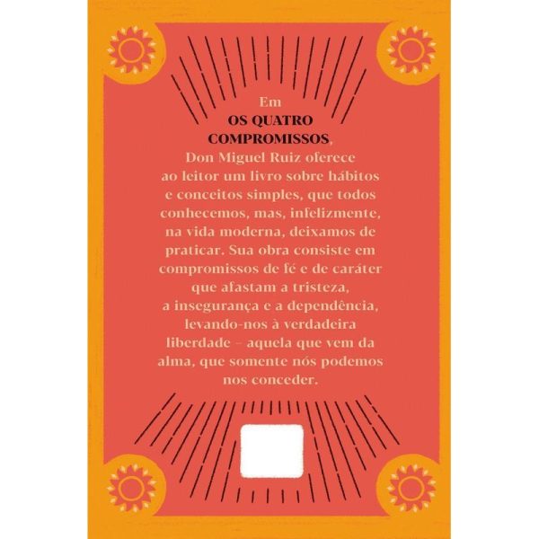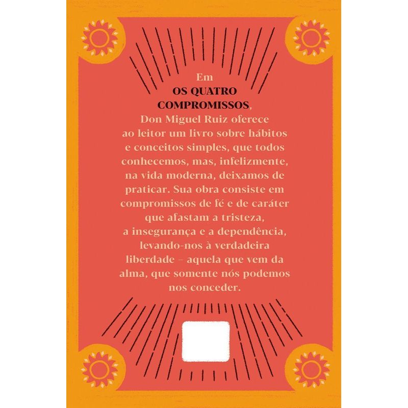 O livro clássico da autoajuda baseado na filosofia tolteca. Um guia prático para a liberdade pessoal. Os quatro compromissos apresenta a possibilidade de uma nova vida, repleta de energia, felicidade genuína e amor. Sua abordagem tem base no pensamento dos antigos toltecas, povo que habitava a região do atual México. Don Miguel Ruiz acredita que, para conquistar essa nova vida, basta estabelecer e honrar quatro compromissos básicos: seja impecável com sua palavra, não leve nada para o lado pessoal, não tire conclusões e sempre dê o melhor de si. Em Os quatro compromissos você vai descobrir a fonte de crenças autolimitantes que nos roubam a alegria e criam sofrimentos desnecessários. Baseadas na sabedoria ancestral tolteca, as ideias contidas neste livro explicam de forma esclarecedora como somos influenciados e profundamente modificados de acordo com os padrões exigidos pela sociedade moderna Don Miguel Ruiz oferece ao leitor um guia sobre hábitos e conceitos simples, que todos conhecemos, mas, infelizmente, deixamos de praticar. Os quatro compromissos consiste em compromissos de fé e de caráter que afastam a tristeza, a insegurança e a dependência, levando-nos à verdadeira liberdade – aquela que vem da alma, que somente nós podemos nos conceder. Nesta nova edição repaginada de Os quatro compromissos você descobrirá um poderoso código de conduta que pode rapidamente transformar sua vida em uma nova experiência de liberdade verdadeira, felicidade e amor.