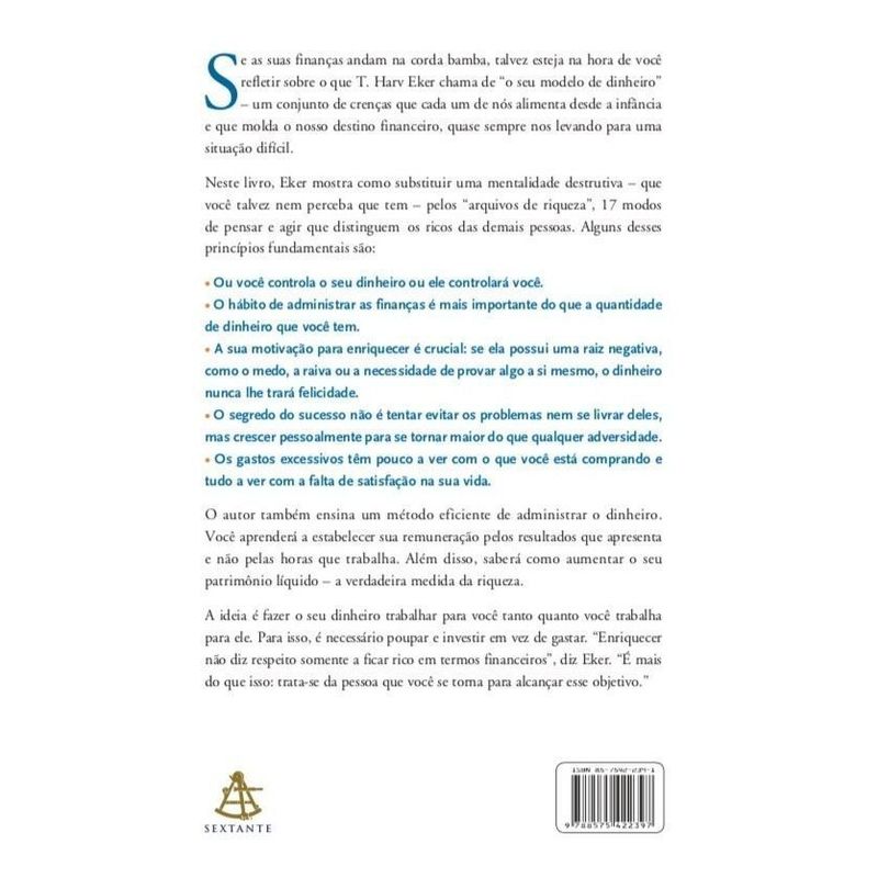 Aprenda a enriquecer mudando seus conceitos sobre o dinheiro e adotando os hábitos das pessoas bem-sucedidas “T. Harv Eker desmistifica o motivo pelo qual algumas pessoas estão destinadas à riqueza e outras a uma vida de dureza. Se você quer conhecer as causas fundamentais do sucesso, leia este livro.” – Robert G. Allen, autor de O milionário em um minuto Se as suas finanças andam na corda bamba, talvez esteja na hora de você refletir sobre o que T. Harv Eker chama de “o seu modelo de dinheiro” – um conjunto de crenças que cada um de nós alimenta desde a infância e que molda o nosso destino financeiro, quase sempre nos levando para uma situação difícil. Nesse livro, Eker mostra como substituir uma mentalidade destrutiva – que você talvez nem perceba que tem – pelos “arquivos de riqueza”, 17 modos de pensar e agir que distinguem os ricos das demais pessoas. Alguns desses princípios fundamentais são: • Ou você controla o seu dinheiro ou ele controlará você. • O hábito de administrar as finanças é mais importante do que a quantidade de dinheiro que você tem. • A sua motivação para enriquecer é crucial: se ela possui uma raiz negativa, como o medo, a raiva ou a necessidade de provar algo a si mesmo, o dinheiro nunca lhe trará felicidade. • O segredo do sucesso não é tentar evitar os problemas nem se livrar deles, mas crescer pessoalmente para se tornar maior do que qualquer adversidade. • Os gastos excessivos têm pouco a ver com o que você está comprando e tudo a ver com a falta de satisfação na sua vida. O autor também ensina um método eficiente de administrar o dinheiro. Você aprenderá a estabelecer sua remuneração pelos resultados que apresenta e não pelas horas que trabalha. Além disso, saberá como aumentar o seu patrimônio líquido – a verdadeira medida da riqueza. A ideia é fazer o seu dinheiro trabalhar para você tanto quanto você trabalha para ele. Para isso, é necessário poupar e investir em vez de gastar. “Enriquecer não diz respeito somente a ficar rico em termos financeiros”, diz Eker. “É mais do que isso: trata-se da pessoa que você se torna para alcançar esse objetivo.”
