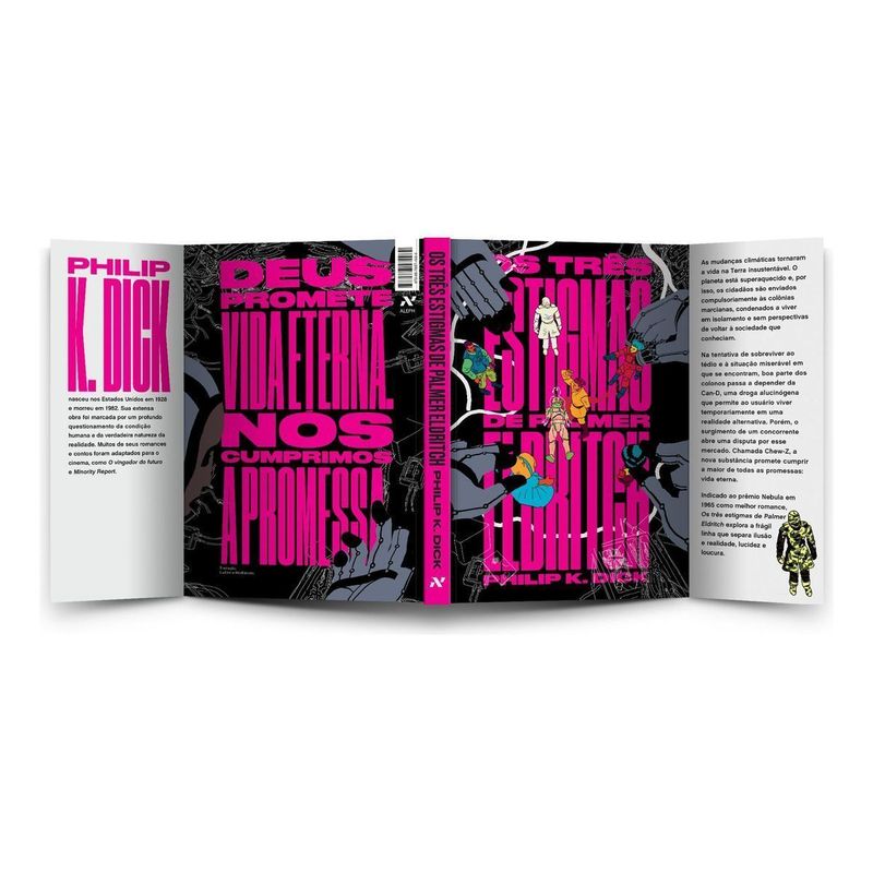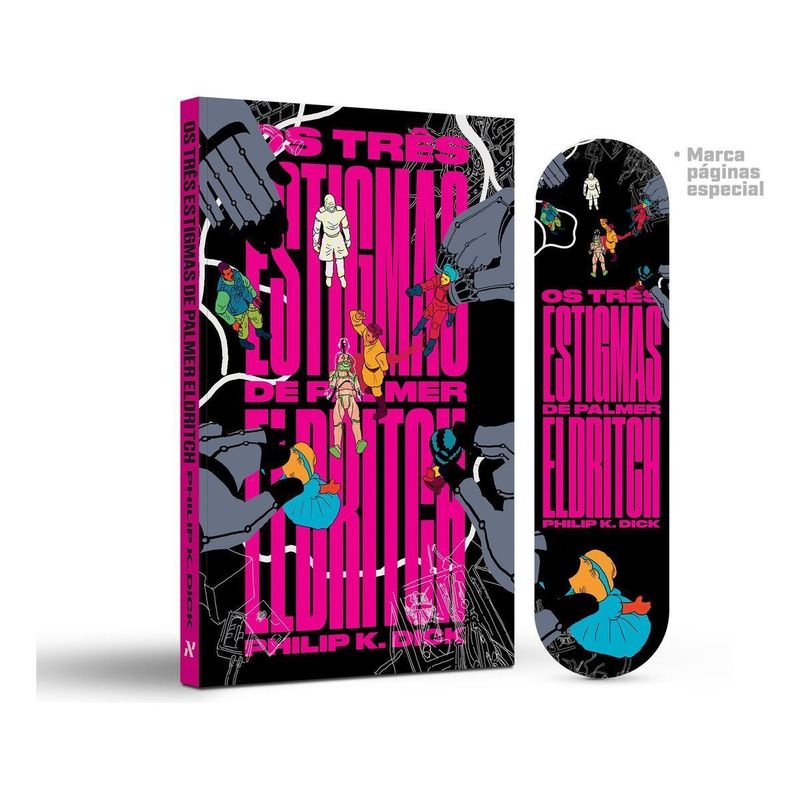 “Deus promete vida eterna. Nós cumprimos a promessa.” Indicado ao prêmio Nebula como melhor romance, Os três estigmas de Palmer Eldritch questiona a verdadeira natureza da realidade e a frágil linha que separa lucidez e loucura. As mudanças climáticas tornaram a vida na Terra insustentável. O planeta está superaquecido e por isso os cidadãos são enviados compulsoriamente às colônias marcianas, condenados a viver em isolamento e sem perspectivas de voltar à sociedade que conheciam. Na tentativa de sobreviver ao tédio e à situação miserável em que se encontram, boa parte dos colonos passa a depender da Can-D, uma droga alucinógena que permite ao usuário viver temporariamente em uma realidade alternativa. Porém, o surgimento de um concorrente abre uma disputa por esse mercado. Chamada Chew-Z, a nova substância promete cumprir a maior de todas as promessas: vida eterna. Publicado pela primeira vez em 1965, Os três estigmas de Palmer Eldritch explora um futuro em que a humanidade colonizou outros planetas e trabalhadores usam drogas para suportar a realidade. Traz críticas a sistemas opressivos e ao poder de grandes corporações, além de ser uma das primeiras vezes em que Philip K. Dick apresenta temas religiosas em uma obra. Relançado sete anos após sua última publicação no Brasil, a nova edição conta com capa ilustrada por Rafael Coutinho, projeto gráfico de Giovanna Cianelli e tradução por Ludimila Hashimoto.