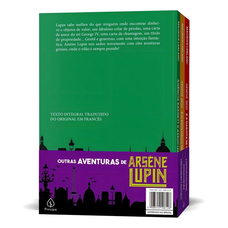 Arsène Lupin, que conseguiu ser mais famoso que seu criador, nasceu por encomenda do editor Pierre Lafitte ao escritor Maurice Leblanc. Este kit reúne as aventuras do maior ladrão do mundo com os títulos: ‘Arsène Lupin e a garota de olhos verdes’, ‘Arsène Lupin e o estilhaço de Obus’ e ‘Agência Barnett e associados’.