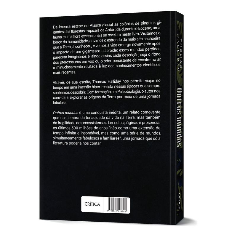 EXPLORE AS ORIGENS DA TERRA POR MEIO DE UMA JORNADA FABULOSA Da imensa estepe do Alasca glacial às colônias de pinguins gigantes das florestas tropicais da Antártida durante o Eoceno, uma fauna e flora excepcionais se revelam neste livro. Visitamos o berço da humanidade, ouvimos o estrondo da mais alta cachoeira que a Terra já conheceu, e vemos a vida emergir novamente após o impacto de um gigantesco asteroide: esses mundos perdidos parecem imaginários e, ainda assim, cada descrição, seja o ritmo dos pterossauros em voo ou o odor persistente de enxofre no ar, é minuciosamente relatada à luz dos conhecimentos científicos mais recentes. Através de sua escrita, Thomas Halliday nos permite viajar no tempo em uma imersão hiper-realista nessas épocas que sempre sonhamos descobrir. Com formação em Paleobiologia, o autor nos convida a explorar as origens da Terra por meio de uma jornada fabulosa. Outros mundos é uma conquista inédita, um relato comovente que nos lembra da tenacidade da vida na Terra, mas também da fragilidade dos ecossistemas. Ler estas páginas é presenciar os últimos 500 milhões de anos “não como uma extensão de tempo infinita e insondável, mas como uma série de mundos, simultaneamente fabulosos e familiares”, uma jornada que só a literatura poderia nos contar.