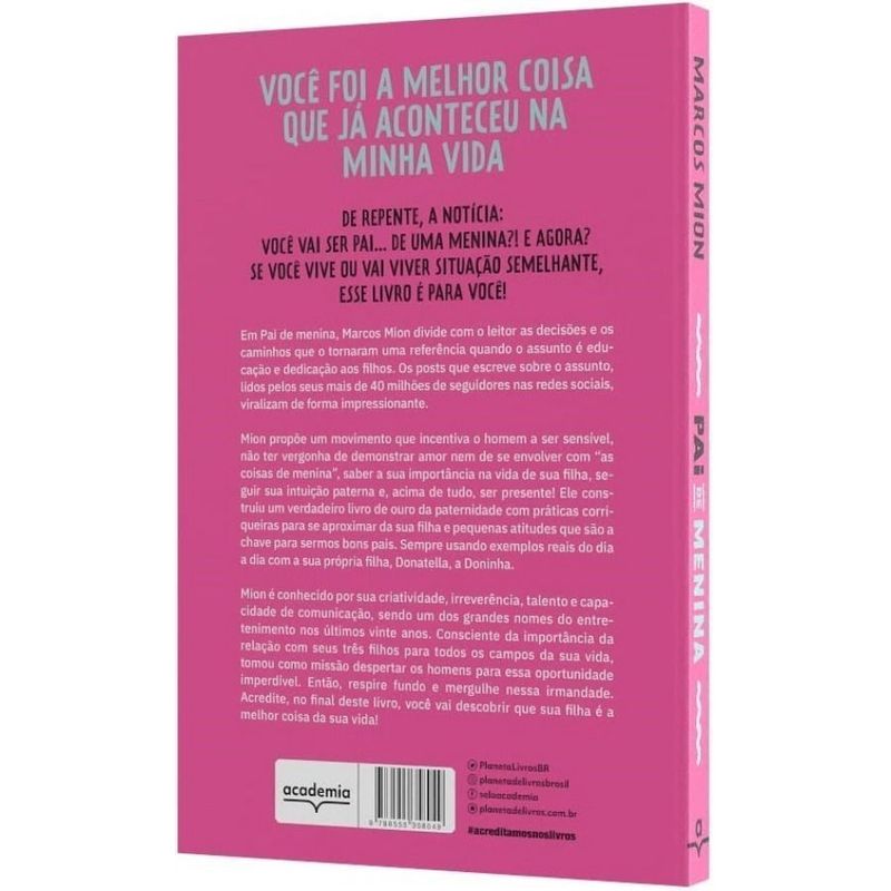 De repente, a notícia: você vai ser pai… de uma MENINA?! E agora? Se você vive ou vai viver situação semelhante, esse livro é para você! Em Pai de menina, Marcos Mion divide com o leitor as decisões e os caminhos que o tornaram uma referência quando o assunto é educação e dedicação aos filhos. Os posts que escreve sobre o assunto, lidos pelos seus mais de 28,5 milhões de seguidores nas redes sociais, viralizam de forma impressionante. Mion propõe um movimento que incentiva o homem a ser sensível, não ter vergonha de demonstrar amor nem de se envolver com “as coisas de menina”, saber a sua importância na vida de sua filha, seguir sua intuição paterna e, acima de tudo, ser presente! Ele constrói um verdadeiro guia para os pais. Apresenta práticas corriqueiras para se aproximar da sua filha e pequenas atitudes que são a chave para sermos bons pais. Sempre usando exemplos reais do dia a dia com a sua própria filha, Donatella, a Doninha. Mion é conhecido por sua criatividade, irreverência, talento e capacidade de comunicação, sendo um dos grandes nomes do entretenimento nos últimos 20 anos. Consciente da importância da relação com seus três filhos para todos os campos da sua vida, tomou como missão despertar os homens para essa oportunidade imperdível. Então, respire fundo e mergulhe nessa irmandade. Acredite, no final deste livro, você vai descobrir que sua filha é a melhor coisa da sua vida!