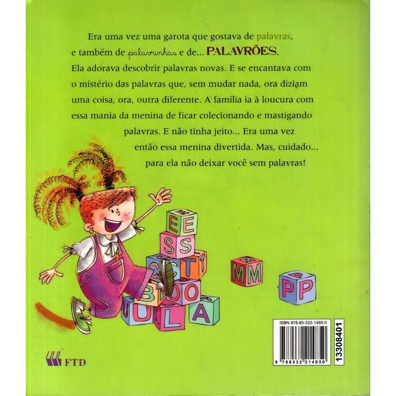 Por que palavrões podem ser palavras grandes, ou às vezes, pequenas? Por que às vezes são palavras proibidas, outras vezes não, dependendo do caso? A menina desta história não gostava nada dessa confusão e toma uma decisão importante – não falará mais nenhuma palavra! Só que a chegada de uma nova irmãzinha faz com que ela mude de ideia e veja que brincar com as palavras de nossa língua é um barato!