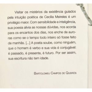 Os poemas deste livro foram selecionados e organizados por Bartolomeu Campos de Queirós, escritor, que como Cecília Meireles, também conhecia o encantamento que as palavras produzem. No prefácio, o poeta comenta: Movida, assim, me parece, pelo afeto e respeito que promovem a dignidade do sujeito, ela não se esqueceu do tamanho do tempo. Cecília Meireles se expressou de maneira sofisticadamente simples. Daí sua poesia se tornar propícia a todos, inaugurando vários níveis de leitura, como convém à literatura. (…) soube como ninguém, que o homem é o verbo e sua vida conjugável: é passado, é presente, é futuro. Por ser assim, sua escritura não tem idade.