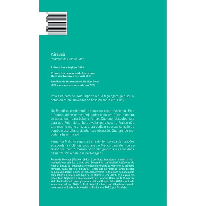 No Paradise, condomínio de luxo na costa mexicana, Polo e Franco, adolescentes enjeitados cada um à sua maneira, se aproximam para beber e fumar. Qualquer desculpa vale para que Polo não tenha de voltar para casa, e Franco não tem mesmo muito a fazer, afora dedicar-se a sua coleção de pornôs e espreitar a vizinha, sua obsessão. Que grande mal poderia haver nisso? Fernanda Melchor segue a trilha de Temporada de furacões ao abordar a violência cotidiana no México para além de estereótipos, com o mesmo ritmo vertiginoso e a capacidade de narrar sob a pele das personagens. Indicado ao International Booker Prize 2022