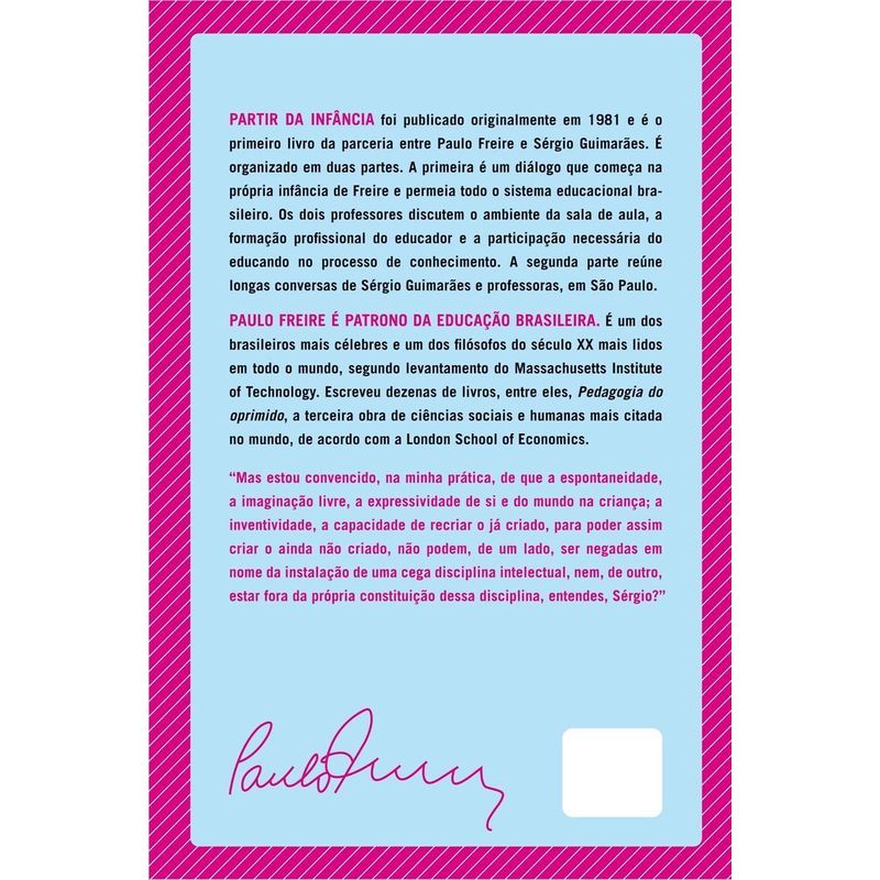 Paulo Freire em defesa da comunicação na educação. Partir da infância foi publicado originalmente em 1981 e é o primeiro livro da parceria entre Paulo Freire e Sérgio Guimarães. É organizado em duas partes. Na primeira, diálogo começa na própria infância de Freire e permeia todo o sistema educacional brasileiro. Os dois professores discutem o ambiente da sala de aula, a formação profissional do educador e a participação necessária do educando no processo de conhecimento. A segunda parte reúne longas conversas de Sérgio Guimarães e professoras, em São Paulo. Em 1963, em Angicos, interior do Rio Grande do Norte, trezentos trabalhadores rurais foram alfabetizados em apenas 40 horas, pelo método proposto por Paulo Freire. Esse foi o resultado do projeto-piloto do que seria o Programa Nacional de Alfabetização do governo de João Goulart, presidente que viria a ser deposto em março de 1964. Em outubro desse mesmo ano, Freire deixou o Brasil para proteger a própria vida. Apenas voltou a visitar o país em 1979, com a abertura democrática. “Mas estou convencido, na minha prática, de que a espontaneidade, a imaginação livre, a expressividade de si e do mundo na criança; a inventividade, a capacidade de recriar o já criado, para poder assim criar o ainda não criado, não podem, de um lado, ser negadas em nome da instalação de uma cega disciplina intelectual, nem, de outro, estar fora da própria constituição dessa disciplina, entendes, Sérgio?”