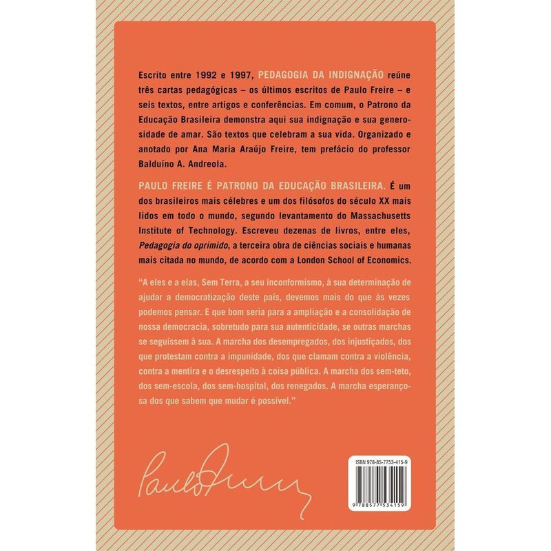 Escrito entre 1992 e 1997, Pedagogia da indignação reúne três cartas pedagógicas – os últimos escritos de Paulo Freire – e seis textos, entre artigos e conferências. Em comum, o Patrono da Educação Brasileira demonstra aqui sua indignação e sua generosidade de amar. São textos que celebram a sua vida. Organizado e anotado por Ana Maria Araújo Freire, tem prefácio do professor Balduíno A. Andreola.* Em 1963, em Angicos, interior do Rio Grande do Norte, trezentos trabalhadores rurais foram alfabetizados em apenas 40 horas, pelo método proposto por Paulo Freire. Esse foi o resultado do projeto-piloto do que seria o Programa Nacional de Alfabetização do governo de João Goulart, presidente que viria a ser deposto em março de 1964. Em outubro desse mesmo ano, Freire deixou o Brasil para proteger a própria vida. Apenas voltou a visitar o país em 1979, com a abertura democrática. Ao longo de sua história, Paulo Freire recebeu mais de cem títulos de doutor honoris causa, de diversas universidades nacionais e estrangeiras, além de inúmeros prêmios, como Educação para a Paz, da Unesco, e Ordem do Mérito Cultural, do governo brasileiro. Integra o International Adult and Continuing Education Hall of Fame e o Reading Hall of Fame. * “A eles e a elas, Sem Terra, a seu inconformismo, à sua determinação de ajudar a democratização deste país, devemos mais do que às vezes podemos pensar. E que bom seria para a ampliação e a consolidação de nossa democracia, sobretudo para sua autenticidade, se outras marchas se seguissem à sua. A marcha dos desempregados, dos injustiçados, dos que protestam contra a impunidade, dos que clamam contra a violência, contra a mentira e o desrespeito à coisa pública. A marcha dos sem-teto, dos sem-escola, dos sem-hospital, dos renegados. A marcha esperançosa dos que sabem que mudar é possível.”