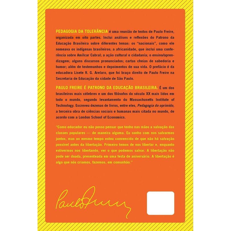 Pedagogia da tolerância é uma reunião de textos de Paulo Freire, organizada e anotada por Ana Maria Araújo Freire. Inclui análises e reflexões do Patrono da Educação Brasileira sobre diferentes temas: os “nacionais”, como ele nomeava os indígenas brasileiros; a africanidade, que inclui uma conferência sobre Amílcar Cabral; a ação cultural e cidadania; o ensino/aprendizagem; alguns discursos pronunciados; cartas cheias de sabedoria e humor; além de testemunhos e depoimentos de sua vida. O prefácio é da educadora Lisete R. G. Arelaro, que foi braço direito de Paulo Freire na Secretaria de Educação da cidade de São Paulo. Em 1963, em Angicos, interior do Rio Grande do Norte, 300 trabalhadores rurais foram alfabetizados em apenas 40 horas, pelo método proposto por Paulo Freire. Esse foi o resultado do projeto-piloto do que seria o Programa Nacional de Alfabetização do governo de João Goulart, presidente que viria a ser deposto em março de 1964. Em outubro desse mesmo ano, Freire deixou o Brasil para proteger a própria vida. Apenas voltou a visitar o país em 1979, com a abertura democrática Ao longo de sua história, Paulo Freire recebeu mais de cem títulos de doutor honoris causa, de diversas universidades nacionais e estrangeiras, além de inúmeros prêmios, como Educação para a Paz, da Unesco, e Ordem do Mérito Cultural, do governo brasileiro. Integra o International Adult and Continuing Education Hall of Fame e o Reading Hall of Fame. “Como educador eu não posso pensar que tenho nas mãos a salvação das classes populares — de maneira alguma. Eu sonho com nos salvarmos juntos, mas ao mesmo tempo estou convencido de que não há salvação possível antes da libertação. Primeiro temos de nos libertar e, enquanto estivermos nos libertando, ver o que podemos salvar. A libertação não pode ser doada, presenteada em uma festa de aniversário. A libertação é algo que nós criamos, fazemos, em comunhão.”