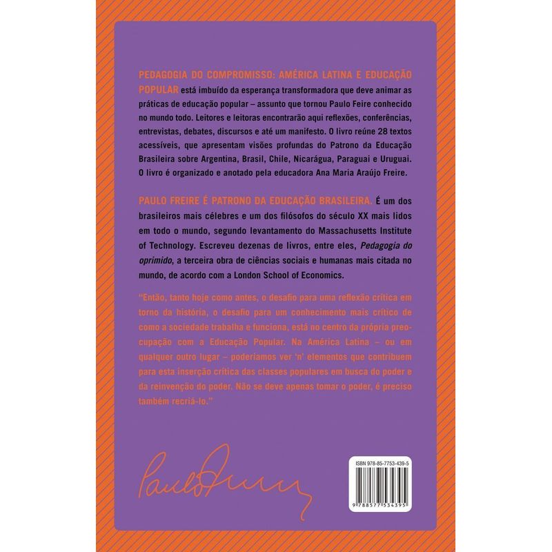 “Diante da conscientização, o fatalismo se desmorona. Há que se lutar. Há que se combater por todos os meios esse fatalismo como primeiro passo para qualquer modificação posterior.” – Paulo Freire Pedagogia do compromisso é uma coletânea que carrega toda a eloquência dos sonhos e da utopia de Paulo Freire. São 28 textos simples, coloquiais, mas ao mesmo tempo com profundas reflexões, que incluem conferências, entrevistas, debates e discursos que têm como tema a Educação Popular – assunto que tornou o educador reconhecido no mundo todo.Mais do que nunca, é necessária uma Pedagogia do compromisso como concretização da esperança transformadora que anima as práticas de Educação Popular, que partem de uma indignação diante de desastrosas consequências do projeto neoliberal e afirmam a possibilidade da construção de sonhos possíveis de sociedades mais justas, com equidade, substantivamente democráticas e sustentáveis.
