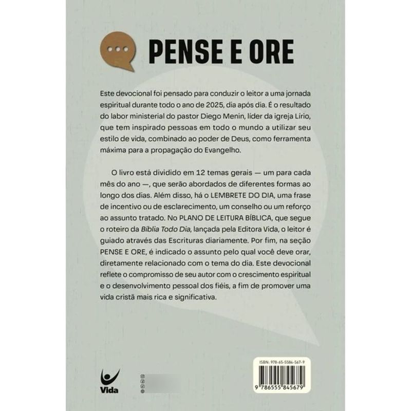 Pense e ore irá conduzi-lo a uma jornada espiritual durante todo o ano. Por meio da meditação diária na Palavra, você alcançará um novo nível de intimidade em seu relacionamento com o Senhor, e será surpreendido pelo agir de Deus em sua vida.O livro está dividido em 12 temas gerais, um para cada mês do ano. Além disso, em cada dia, você encontrará três seções importantes: o LEMBRETE DO DIA, com uma frase de incentivo, aconselhamento ou um reforço ao assunto tratado; o PLANO DE LEITURA BÍBLICA, que guiará você através das Escrituras; e a seção PENSE E ORE, que indica o tópico do dia pelo qual orar. Através desta obra cuidadosamente elaborada, você será capaz de desenvolver o seu caráter e crescer espiritualmente, a fim de desfrutar um ano de aprendizado e comunhão íntima com o Pai.