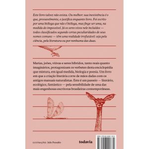 Marias, joões, viúvas e seres híbridos, tanto reais quanto imaginários, protagonizam os verbetes deste breviário de Maria Esther Maciel ilustrado por Julia Panadés. Uma mistura, em igual medida, de biologia e poesia. Um livro em que a criação literária corre de mãos dadas com os antigos manuais naturalistas. Um passeio — literário, ecológico, imaginário — pela sensibilidade de uma das mais engenhosas escritoras brasileiras contemporâneas.
