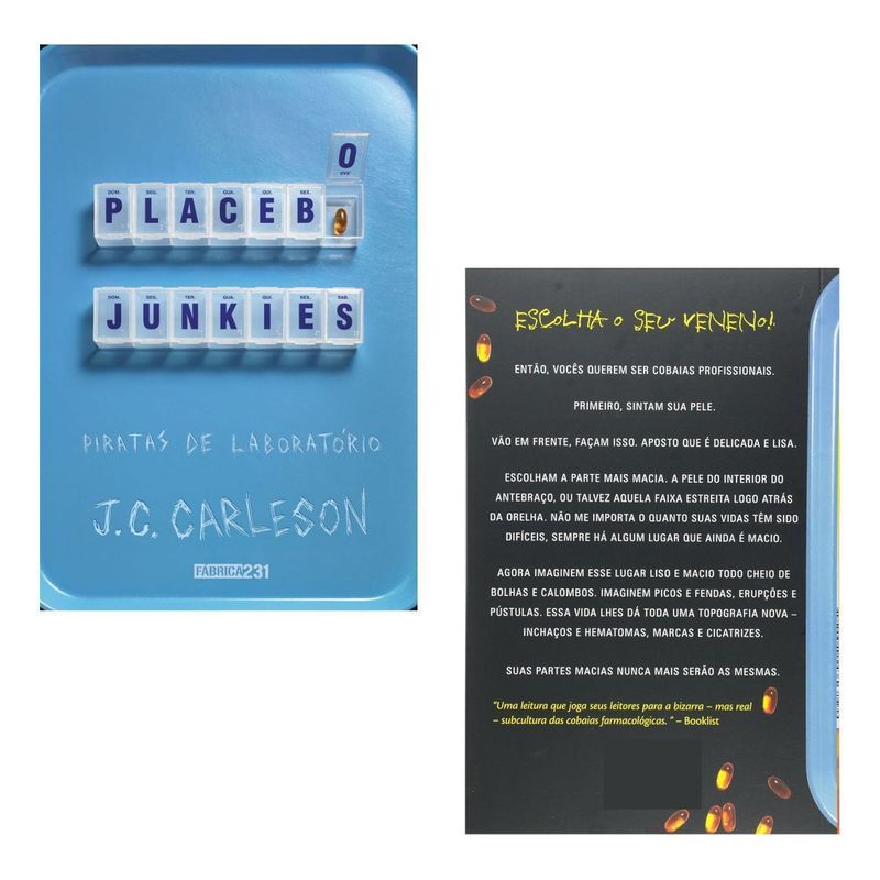 Audie é uma jovem como qualquer outra, mas encontrou uma forma incomum de descolar uns trocados- ela serve de cobaia para a indústria farmacêutica. Neste irreverente romance, J.C. Carleson, ex-agente da CIA, mergulha no universo pouco conhecido, mas muito impressionante, dos voluntários em série de testes farmacológicos. Na tradição de Trainspotting e Drugstore Cowboy, doses cavalares de humor negro disputam espaço na trama com o drama de jovens que vivem no limite. No caso de Audie, ela precisa juntar dinheiro para oferecer a Dylan, seu namorado que tem uma doença terminal, uma festa de aniversário de 18 anos inesquecível. Não há ganho sem dor , ela repete, em meio aos efeitos colaterais das substâncias e procedimentos a que está sujeita e aos esquemas para lidar com eles. Mostrando as entranhas de um mundo desconhecido da maioria das pessoas, Placebo junkies arrancou elogios da crítica com sua narrativa original e completamente viciante.
