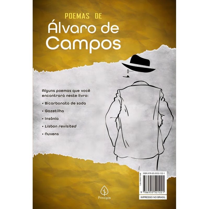 Complexo, enigmático e alter ego de Fernando Pessoa, Álvaro de Campos é o único dos heterônimos que manifestou diferentes fases poéticas. Na decadentista é um jovem cansado e mórbido que foge da realidade por meio do ópio, utiliza aliterações em sua escrita e possui influência de poetas simbolistas. A sua segunda fase é a futurista, em que, com o deslumbre pela civilização moderna e suas máquinas, escreve versos livres e com ausência de pontuação para reforçar a ideia de velocidade. O niilismo impera na última fase, cheia de pessimismo, revolta, frustração e descrença do mundo.