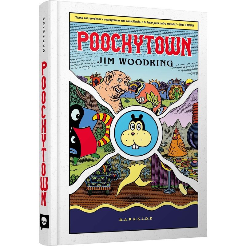 O universo onírico e surreal de um dos maiores quadrinistas de sua geração As fábulas hipnóticas de Jim Woodring têm deslumbrado leitores em todo o mundo desde os anos 1980. Frank, um dos seus personagens mais recorrentes, é um animal antropomorfo indefinido, dentuço, ingênuo, mas não inocente. Entre suas inspirações, estão as primeiras animações que surgiram nas décadas de 1920 e 1930 nos Estados Unidos, sobretudo o trabalho dos irmãos Fleischer, criadores de Bimbo, de 1931, parceiro de Betty Boop em suas aventuras. Como aponta o quadrinista, “ele foi uma das coisas que estabeleceram as bases de minha filosofia da vida”. Além de Bimbo, as influências para esse ser divertido e por vezes bizarro vão desde o movimento Dada e o Surrealismo a nomes como Salvador Dalí, passando pelas ilustrações biológicas de Ernst Haeckel, antigas xilogravuras europeias, Walt Disney, Looney Tunes, e dialogando com seus contemporâneos, como o ícone dos quadrinhos underground Robert Crumb. Suas histórias, geralmente sem texto, apresentam uma narrativa pouco comum, em uma atmosfera e ambientes recorrentes, inspirados na natureza e em cenários construídos pelo homem. Nos anos 1990, Woodring começou a compilar as histórias de Frank e sua turma, e desde então o universo onírico e surreal do personagem vem conquistando cada vez mais fãs e devotos, e inspirando inúmeros artistas, entre eles nomes como o diretor Francis Ford Coppola, os escritores Neil Gaiman e Alan Moore, e o criador de Os Simpsons, Matt Groening. Para Coppola, “Frank é uma criação tão estranha que eu mal sei como descrevê-lo. Sem palavras, atemporal e sem um lugar definido, repleto de personagens e experiências originais, ele existe em suas peculiares e bizarras condições. As histórias de Frank pertencem ao universo fantástico dos mitos antigos e dos contos populares. Assim como as alegorias heroicas que perduram até hoje, as desconcertantes aventuras de Frank em geral parecem tortuosas e dissimuladas; e ainda assim sentimos um senso sutil de determinação. O trabalho de Woodring ilumina esse mundo escondido e nos convida a examiná-lo minuciosamente”. É com muita alegria que a marca DarkSide® Graphic Novel orgulhosamente apresenta a primeira obra de Woodring no Brasil. Poochytown traz as aventuras de Frank e mergulha profundamente na realidade psicodélica e sempre distorcida do universo sem limites criado por Woodring, o Unifactor. Este visionário quadrinho sem palavras, repleto de imagens estranhas e maravilhosas, derivadas de sonhos e histórias de alucinações que o artista atravessou na infância, compõe um dos mais instigantes e deslumbrantes momentos da carreira do artista. No enredo, Frank se depara com um caixote e, dentro dele, aciona um estranho instrumento movido à manivela que lembra uma tuba. Esse objeto libera figuras gigantes e disformes. Este é o só começo da saga que atravessa a vida aparentemente tranquila de Frank. A jornada vai ganhando contornos surreais e por vezes de horror, conforme o protagonista e os amigos que encontra pelo caminho seguem em frente. Ambientes que variam entre o onírico e outros calcados em nossa realidade terrena são o cenário para as experiências aparentemente sem sentido, que vão se transmutando conforme a história avança. Um deleite visual como poucos conseguem alcançar com tamanha beleza, estranheza e uma exuberância de detalhes inspirados no inconsciente. Quem se depara com a simpática figura de Frank certamente não esquecerá dele tão cedo. Como define o pesquisador de quadrinhos Scott McCloud, “Jim Woodring talvez seja o quadrinista mais importante de sua geração. As histórias de Frank são obras-primas, para ler e reler. Cada célula de seu corpo vai se recordar desse trabalho visionário e fascinante”. Preparados para a viagem sem volta ao universo de Frank?