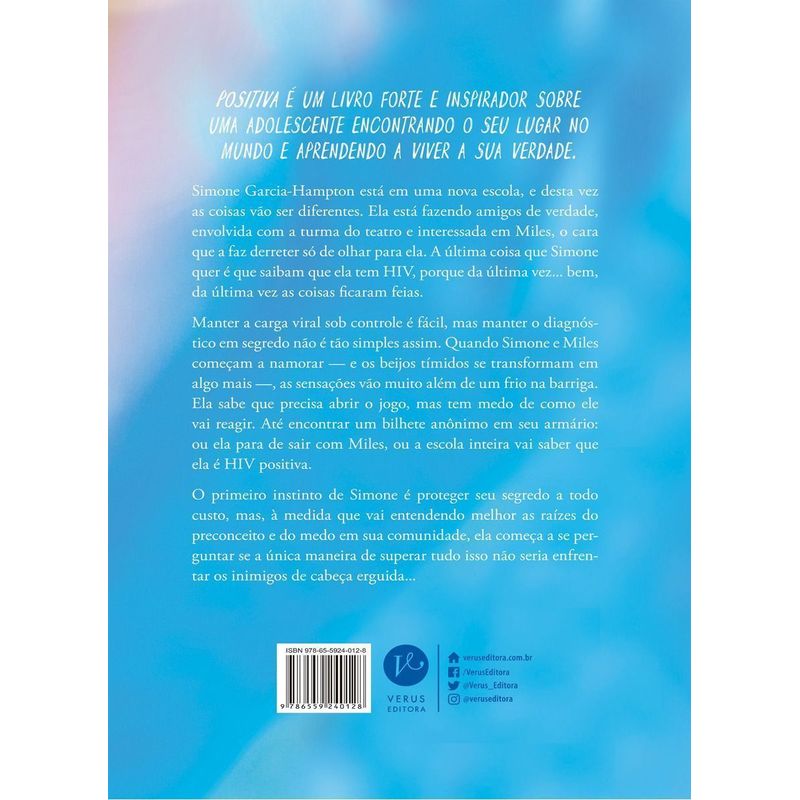 “Positiva é um livro forte e inspirador sobre uma adolescente encontrando o seu lugar no mundo e aprendendo a viver a sua verdade. Simone Garcia-Hampton está em uma nova escola, e desta vez as coisas vão ser diferentes. Ela está fazendo amigos de verdade, envolvida com a turma do teatro e interessada em Miles, o cara que a faz derreter só de olhar para ela. A última coisa que Simone quer é que saibam que ela tem HIV, porque da última vez… bem, da última vez as coisas ficaram feias.Manter a carga viral sob controle é fácil, mas manter o diagnóstico em segredo não é tão simples assim. Quando Simone e Miles começam a namorar — e os beijos tímidos se transformam em algo mais —, as sensações vão muito além de um frio na barriga. Ela sabe que precisa abrir o jogo, mas tem medo de como ele vai reagir. Até encontrar um bilhete anônimo em seu armário: ou ela para de sair com Miles, ou a escola inteira vai saber que ela é HIV positiva.O primeiro instinto de Simone é proteger seu segredo a todo custo, mas, à medida que vai entendendo melhor as raízes do preconceito e do medo em sua comunidade, ela começa a se perguntar se a única maneira de superar tudo isso não seria enfrentar os inimigos de cabeça erguida… Poderoso e inspirador, Positiva vai agradar os fãs de Angie Thomas e Nicola Yoon. “Aborda com sucesso a discriminação pela perspectiva de raça, sexualidade e HIV, mas também mostra a possibilidade de viver plenamente apesar de tudo… Uma história sobre dizer a sua verdade, do seu jeito.” — Kirkus Reviews “Os leitores vão torcer pela simpática Simone nesta estreia que aborda sexo de maneira francamente positiva.” — Publishers Weekly “Excitante, engraçado e positivo em termos de sexo, a estreia impressionante de uma escritora ainda adolescente.” — The Guardian “Todos podem aprender algo com este romance… Os leitores vão se apaixonar.” — School Library Journal “Romântico, engraçado, esperançoso e sem sombra de dúvida real.” — Becky Albertalli, autora de Com amor, Simon “O romance YA do ano, sobre o qual todos deveriam estar falando.” — Shondaland “Uma generosa carta de amor à inclusão, à bravura e à aceitação, Positiva é uma maravilha de livro.” — Kathleen Glasgow, autora de Garota em pedaços “Apesar de lidar com um assunto pesado, o livro permanece leve e bem-humorado, ao mesmo tempo em que envolve emoções reais.” — Today Show “Talvez a coisa mais notável que Garrett conquiste… seja o retrato sensível de pessoas que geralmente são tornadas invisíveis não apenas na literatura YA, mas na vida. E ela consegue escrever um romance e tanto enquanto faz isso.” — Entertainment Weekly “Simone é uma narradora extremamente cativante e atenta que também está cheia de dúvidas adolescentes. Uma estreia boa e ousada, às vezes de cair o queixo.” — The Financial Times “Um romance otimista e caloroso que tem o objetivo de desestigmatizar a condição [do HIV positivo] e marca Garrett como uma escritora para ficarmos de olho.” — The Irish Times “
